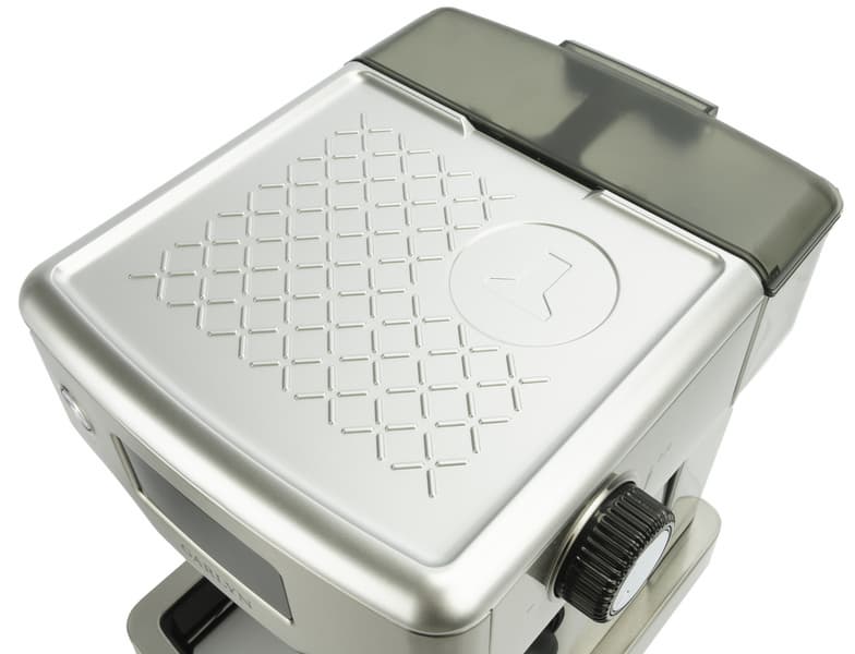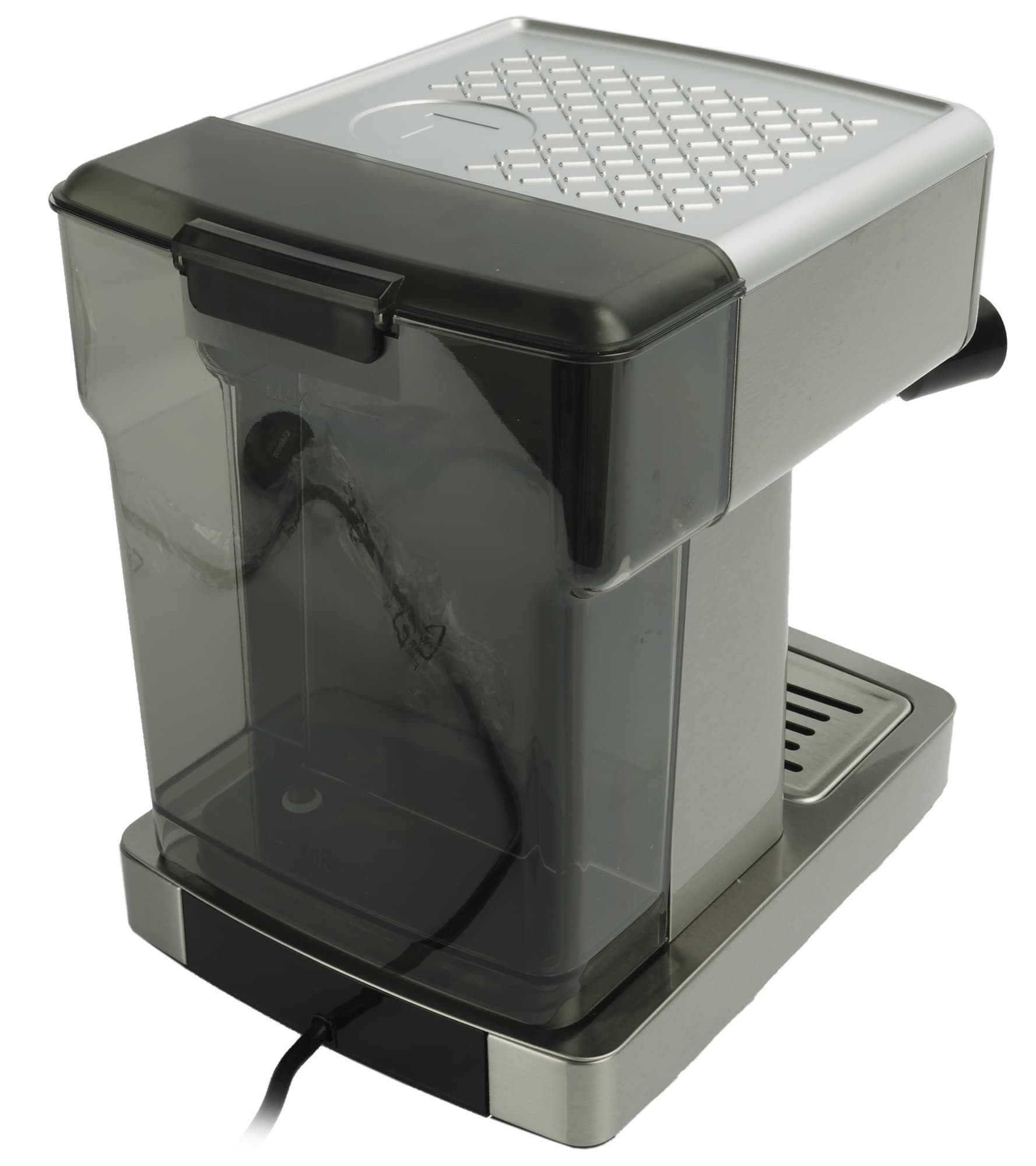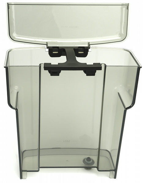 Этот бак из темного прозрачного пластика съемный, с ручкой, выполняющей также функцию распорки и фиксатора. Чтобы поставить емкость на место, нужно совместить выступы с пазами на корпусе кофеварки. Однако чтобы пополнить, не обязательно ее снимать — достаточно открыть верхнюю крышку.