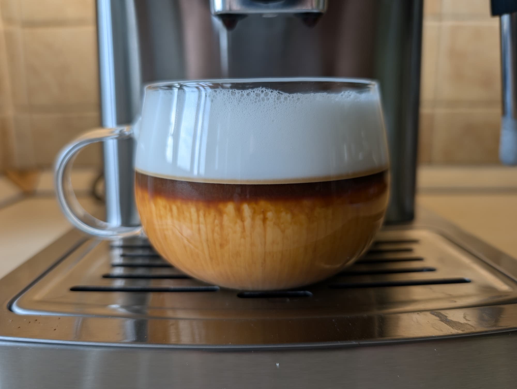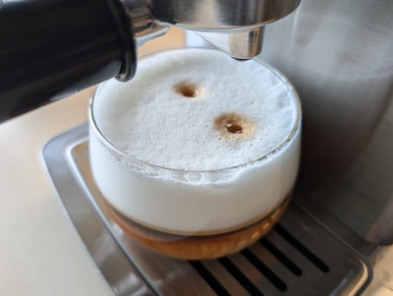 После этого требуется еще одно нажатие на кнопку «Эспрессо», чтобы начать приготовление кофе. За это время взбитое молоко успевает слегка остыть, а пена — осесть.