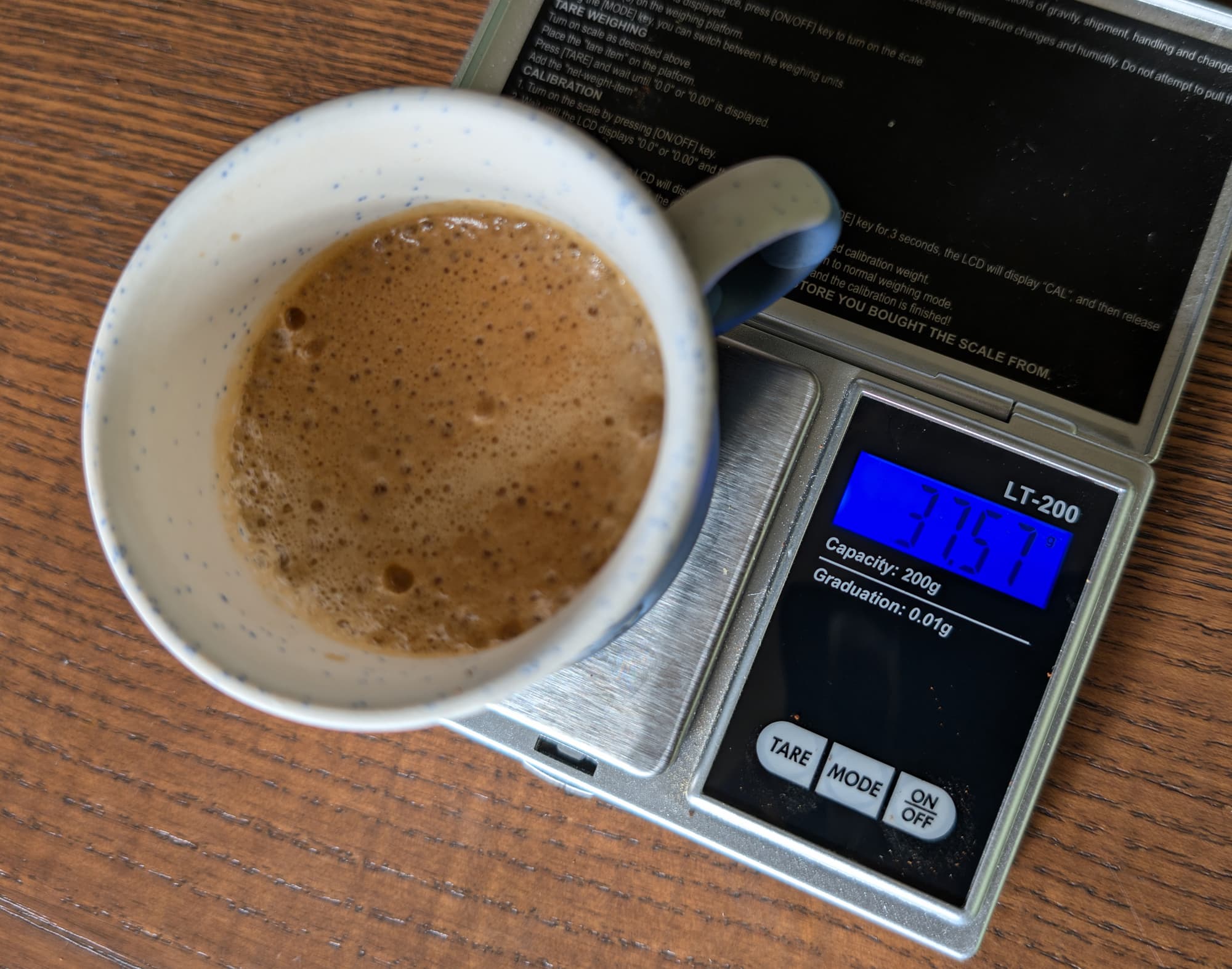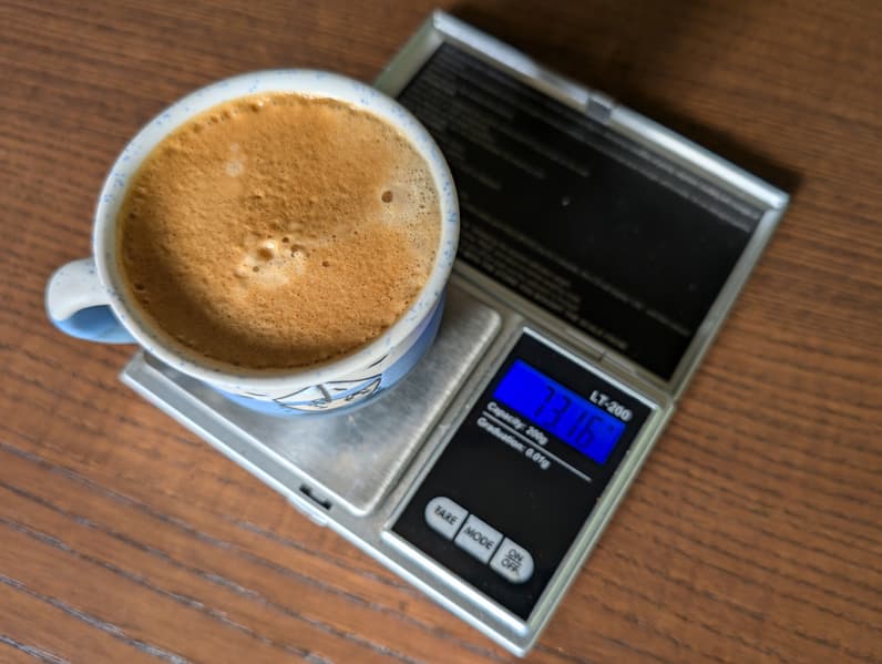 Двойной эспрессо готовится 32 секунды, вес готового напитка составил около 73 г.