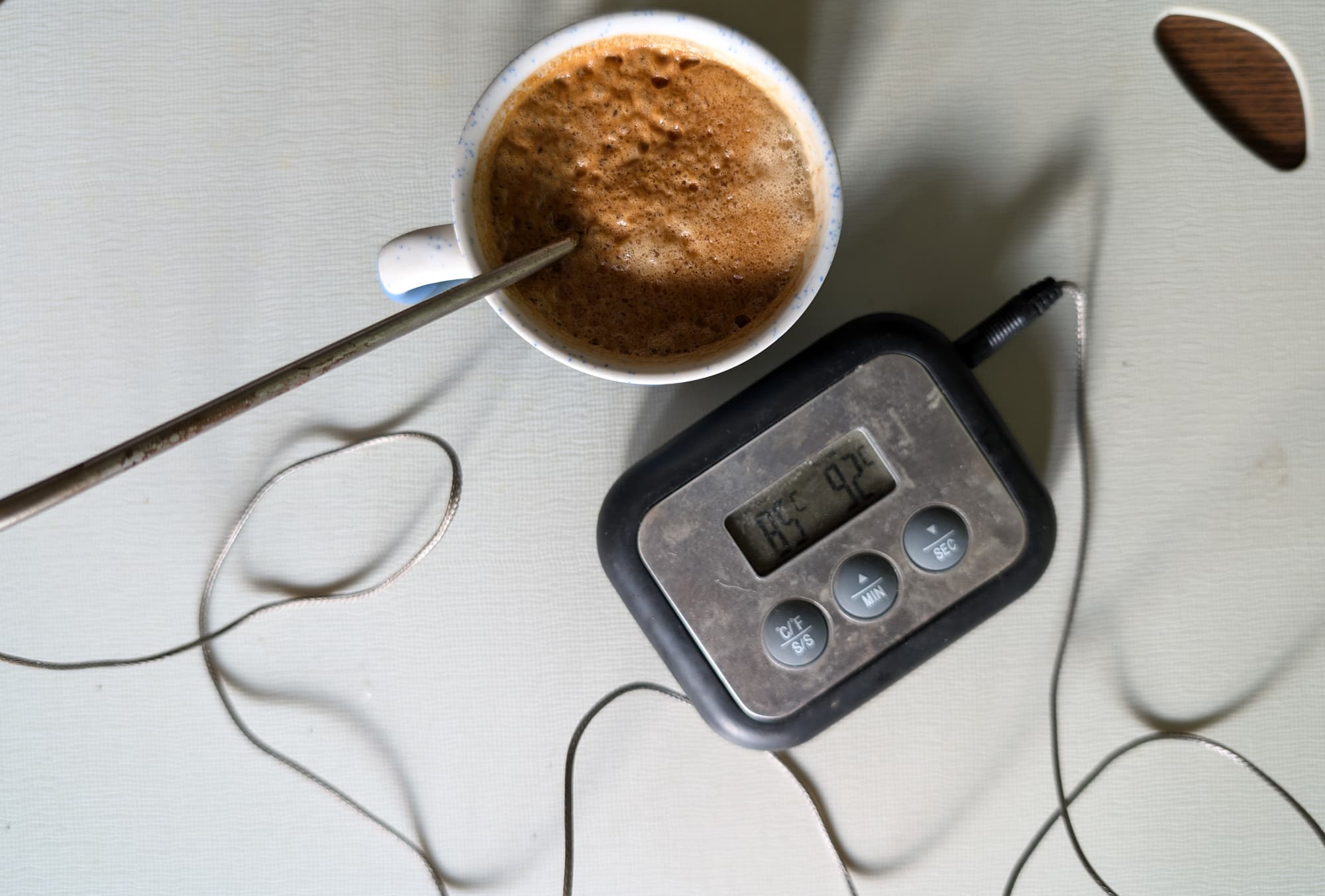 На этот раз температуру готового напитка мы замеряли в чашке, предварительно прогретой в течение 10 минут на панели включенной кофеварки. Результат нас полностью удовлетворил: температура двойного эспрессо в теплой чашке составила 85 °C.