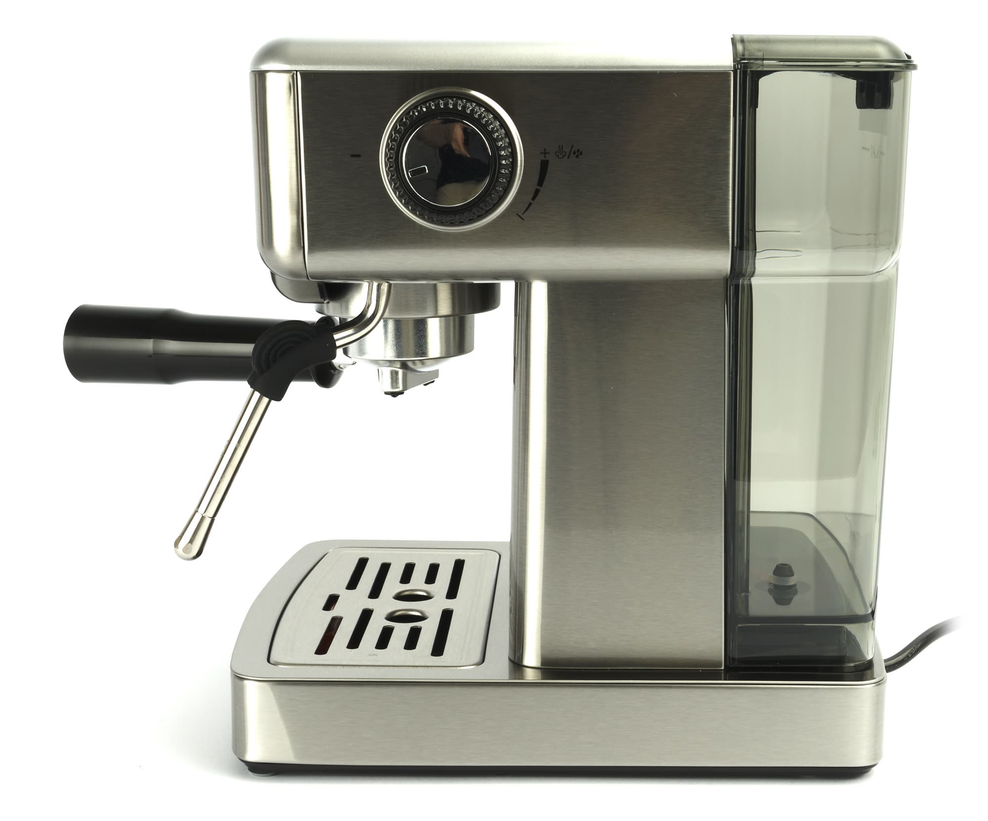 На трубке стимера — съемная металлическая насадка-панарелло и резиновый захват, оберегающий пользователя от ожогов. Капучинатор может вращаться почти на 270° и допускает регулировку наклона приблизительно на 4 см. Управляемый наклон — функция, характерная для полу- и профессиональных моделей, а вот в бюджетных рожковых кофеварках мы до этого видели ее только однажды.
