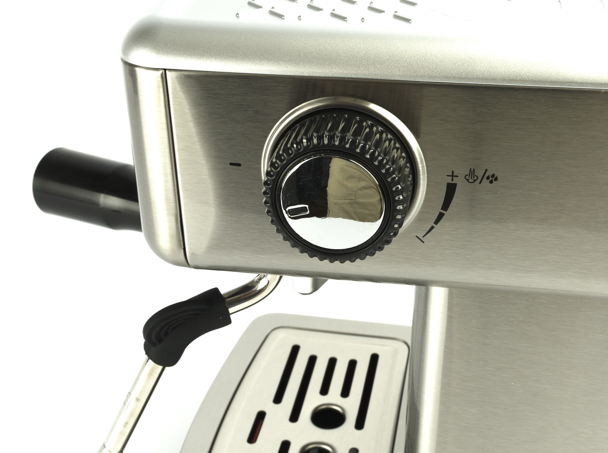 Круглая ручка регулирует подачу пара в стимер. Крайнее левое положение отметки на ней соответствует полностью закрытому клапану, крайнее правое — максимальному парообразованию. Отметки на корпусе позволяют настроить нужное соотношение пара и горячей воды.