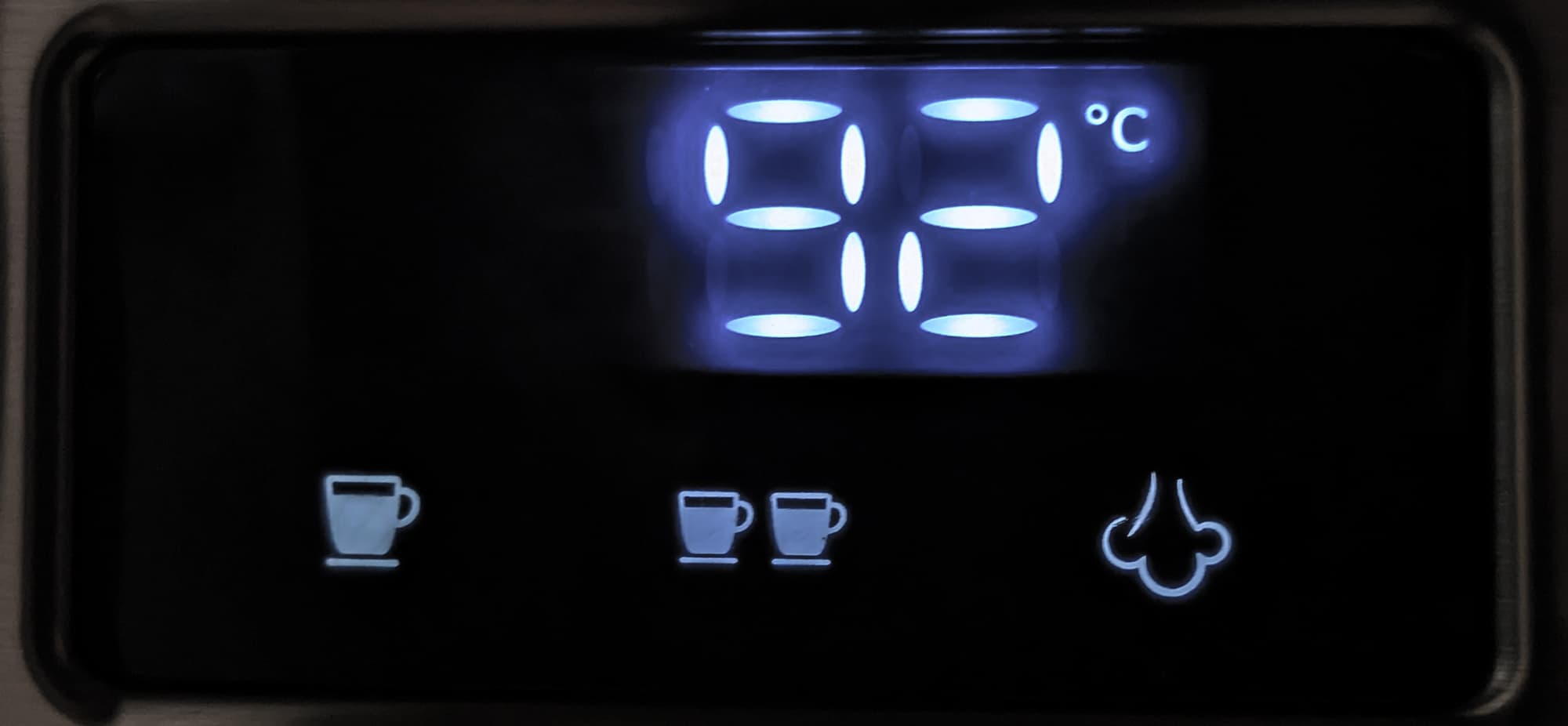 Чтобы приготовить стандартный эспрессо, следует прикоснуться к сенсору с изображением одной чашки, а для двойного — нажать на изображение двух сосудов. Кофеварка издает еще один звуковой сигнал, а на экране запускается прямой отсчет времени приготовления. По окончании работы звучит еще один сигнал, а цифры на дисплее снова начинают показывать рабочую температуру.
