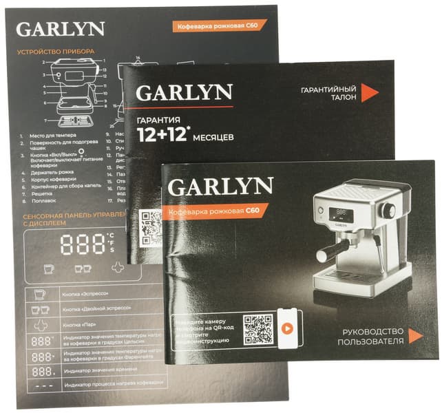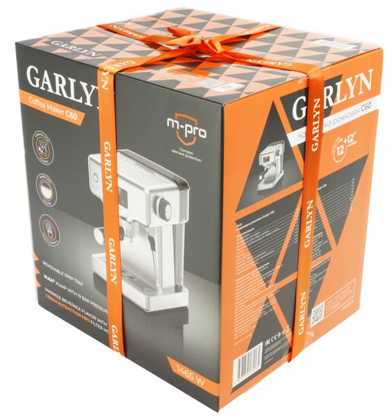 Кофеварка поставляется в картонной коробке, оформленной в узнаваемом стиле Garlyn: полноцветная печать, контрастный узор из черно-оранжевых треугольников и непременная шелковая ленточка с трогательным накладным бантиком, превращающая каждую упаковку в подарочную.