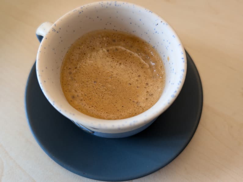 Выглядит одинарный эспрессо неплохо, присутствует выраженная пенка крема́. Вкус мы субъективно оцениваем как средний.