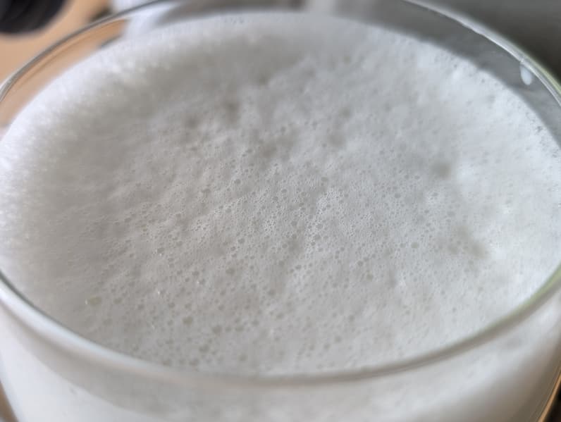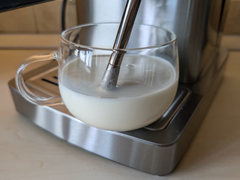 Теперь попробуем приготовить капучино. Для этого мы взяли 150 мл молока из холодильника, поместили в стеклянную чашку, чтобы удобнее было наблюдать за процессом, и включили режим «Пар». Из программы «Кофе» (92 °C) наш прибор разогревается до рабочей температуры (130 °C) довольно быстро: всего за 15 секунд. После этого мы погрузили стимер в жидкость и взбили пену на максимальной интенсивности подачи пара, вручную регулируя глубину погружения насадки.