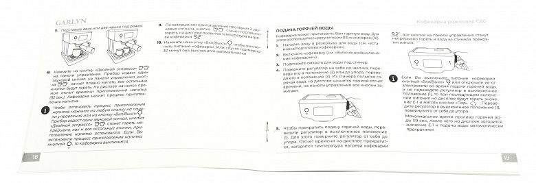 Инструкция содержит исчерпывающую информацию о подготовке кофеварки к работе, ее эксплуатации и уходу за ней. Для тех, кому не хочется читать все 36 страниц технического текста, в комплект документации входит также руководство по быстрому старту: короткой выжимки на небольшой карточке достаточно, чтобы сварить первую чашку эспрессо.
