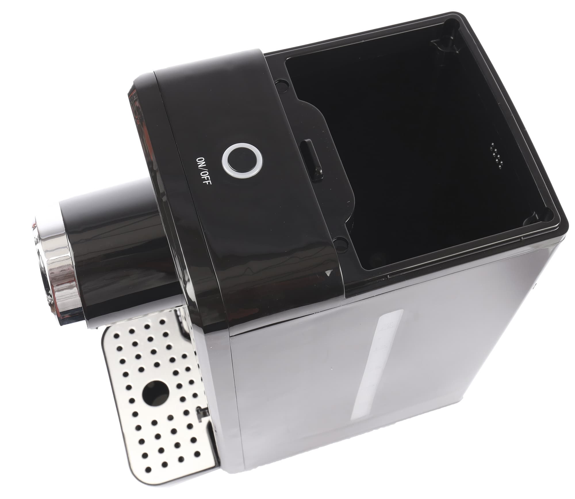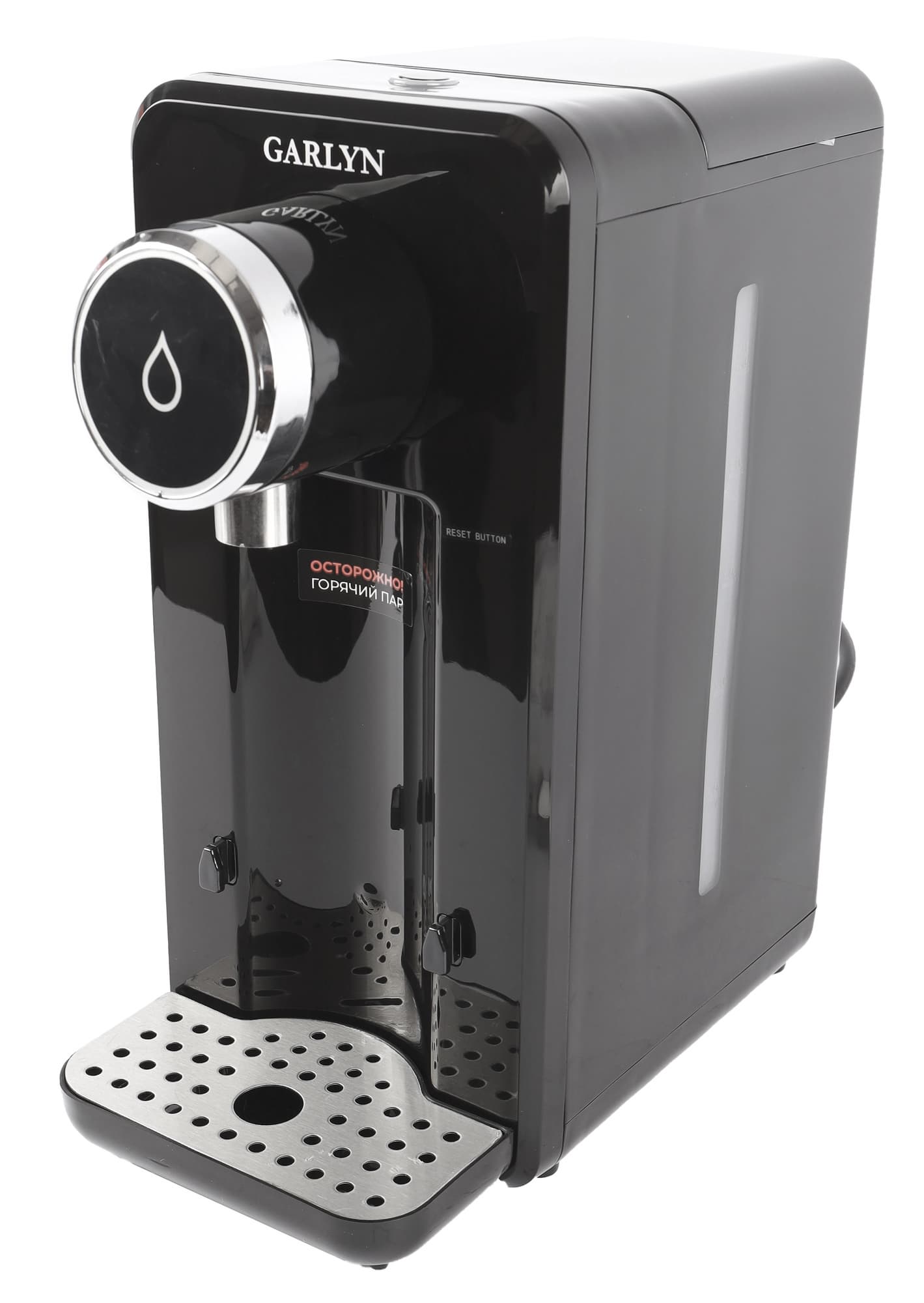 Черный резервуар в 2,5 л расположен в задней части устройства. На белой, полупрозрачной шкале нанесена разметка: 0,5, 1, 1,5, 2 и 2,5 л. Плохо, что она выполнена из того же пластика, что и вся шкала, и не очень легко различима. Важно, чтобы вода не опускалась ниже отметки в 0,5 л и не поднималась выше максимума в 2,5 л. У Garlyn FT-25 есть блокировка включения без воды и автоотключение, но невзрачность градирования всё равно расстроила.