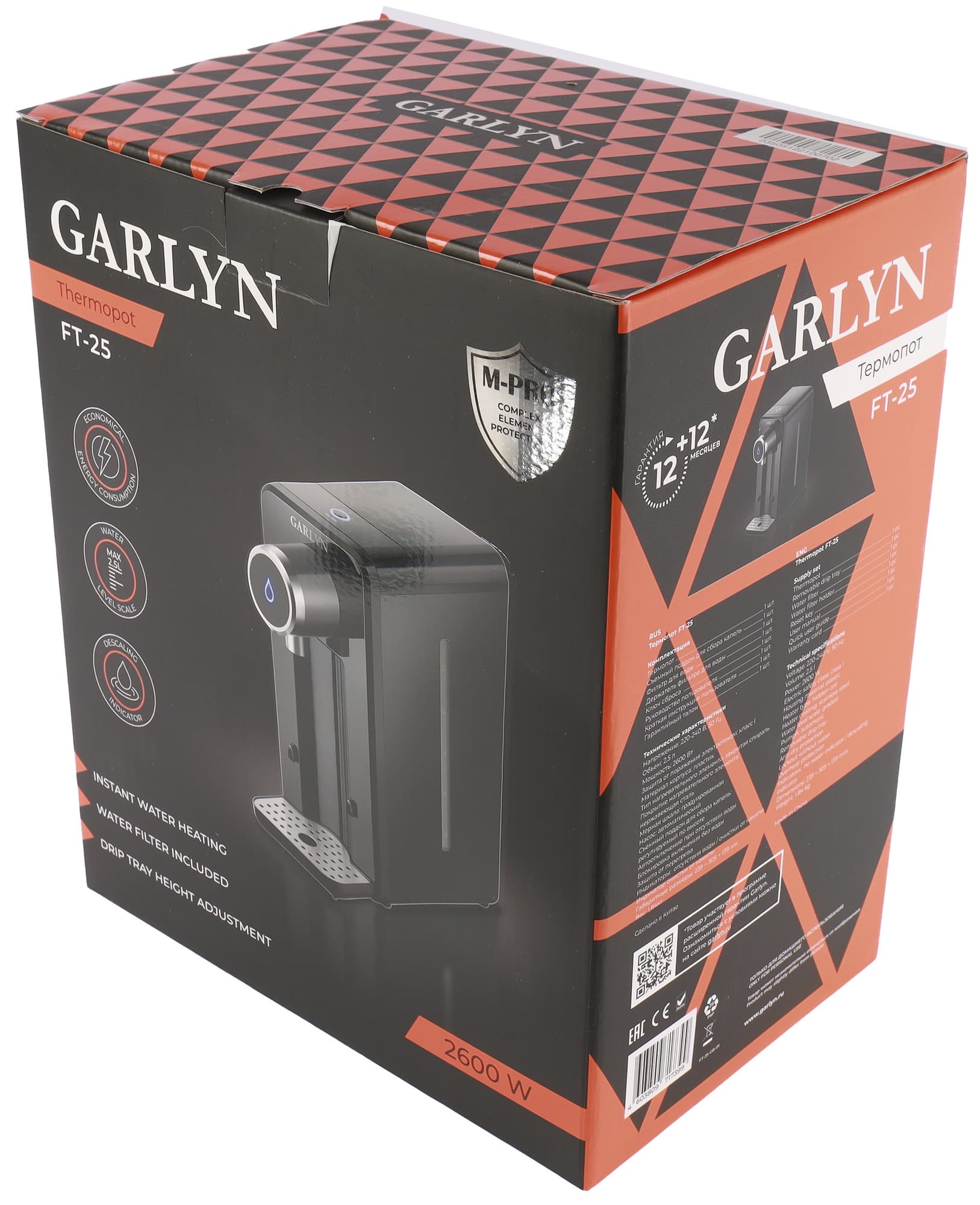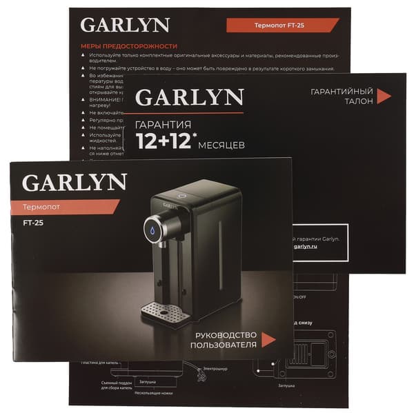 Упакован прибор сразу в две аккуратные коробки. Внешняя — крафтовая, с рисунком и названием модели на стенках. Внутри фирменная, в черно-красных тонах бренда. На ней фотография Garlyn FT-25, характеристики, отдельно вынесены преимущества данного термопота. На одной из узких стенок — рекламные ракурсы FT-25 и QR-код, ведущий на сайт Garlyn. Внутри агрегат защищает пенопластовый ложемент.