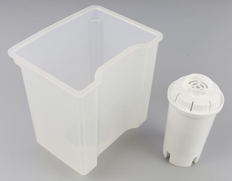 Съемный резервуар-держатель, в который наливается нефильтрованная вода, вмещает около 1600 мл. На то, чтобы полностью пропустить этот объем через прилагаемый фильтр, уходит около 13 минут и 25 секунд. Измерение водородного показателя исходной и отфильтрованной воды показали уменьшение Ph с исходных 6,8 до 4,6. Релевантность использования фильтра уместнее принимать, исходя из местных показателей жесткости воды. Чем жестче она, тем выше необходимость предварительной очистки. На дне бака расположена заглушка, закрывающая место слива остаточной воды. Для очистки прибора её придется вынуть, а затем установить обратно.