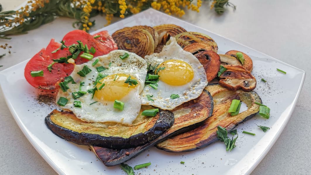 Готовые овощи сняли на тарелку, увеличили температуру нижней панели, уменьшили температуру верхней. Выложили на гриль яйца. Жарили до готовности.