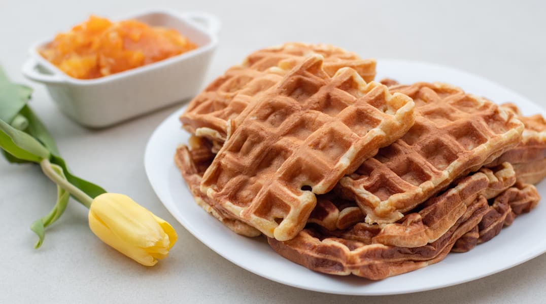 Для вафель сделали тесто из яиц, кефира, масла, муки, апельсинового джема и соды.
