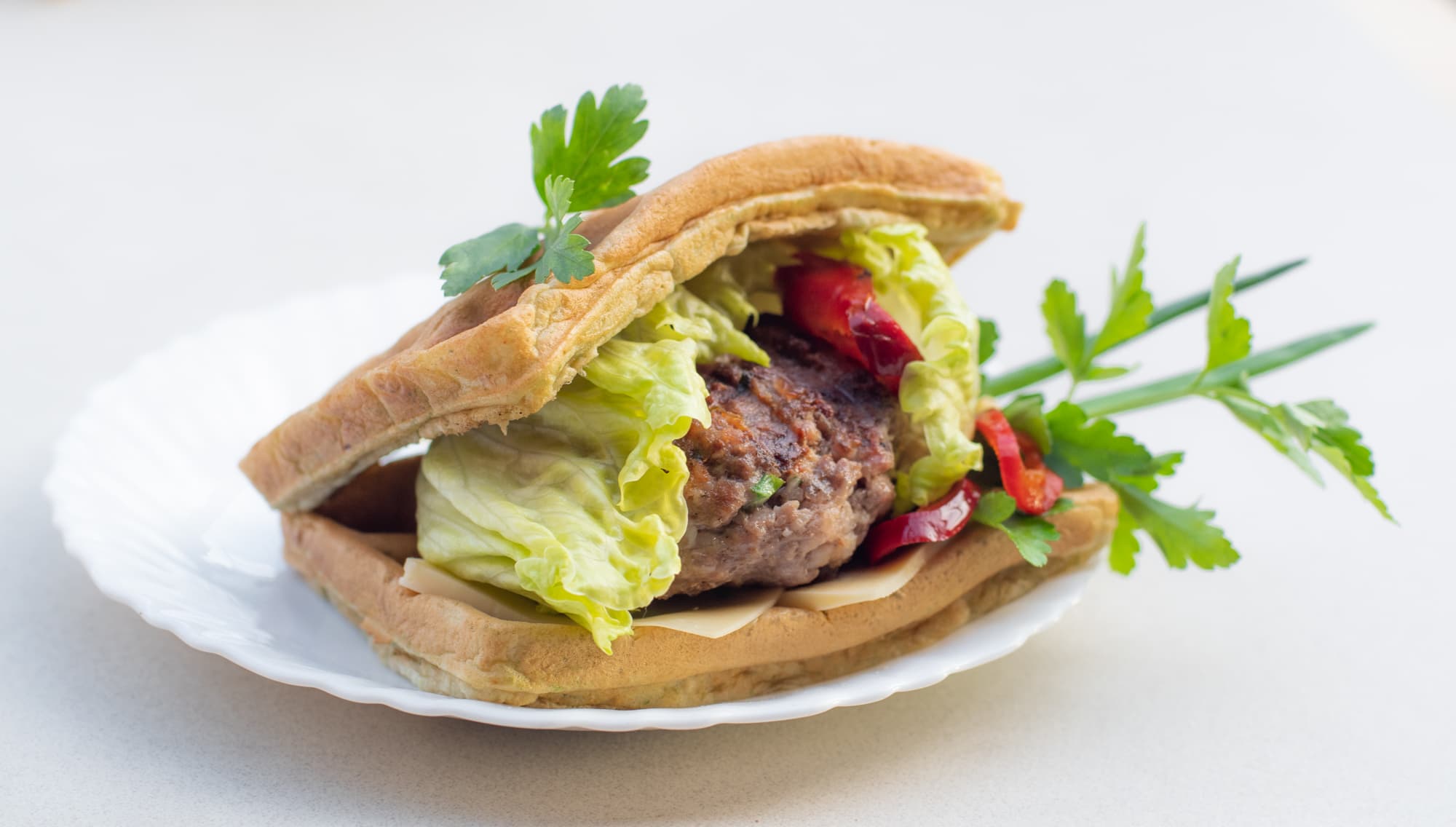 Из получившихся вафель, сыра, зелени и котлет сделали бургеры.