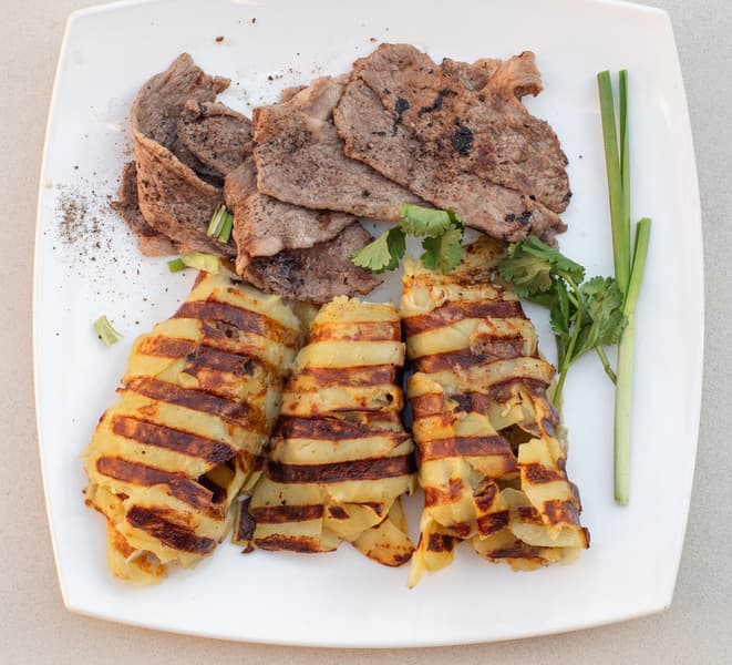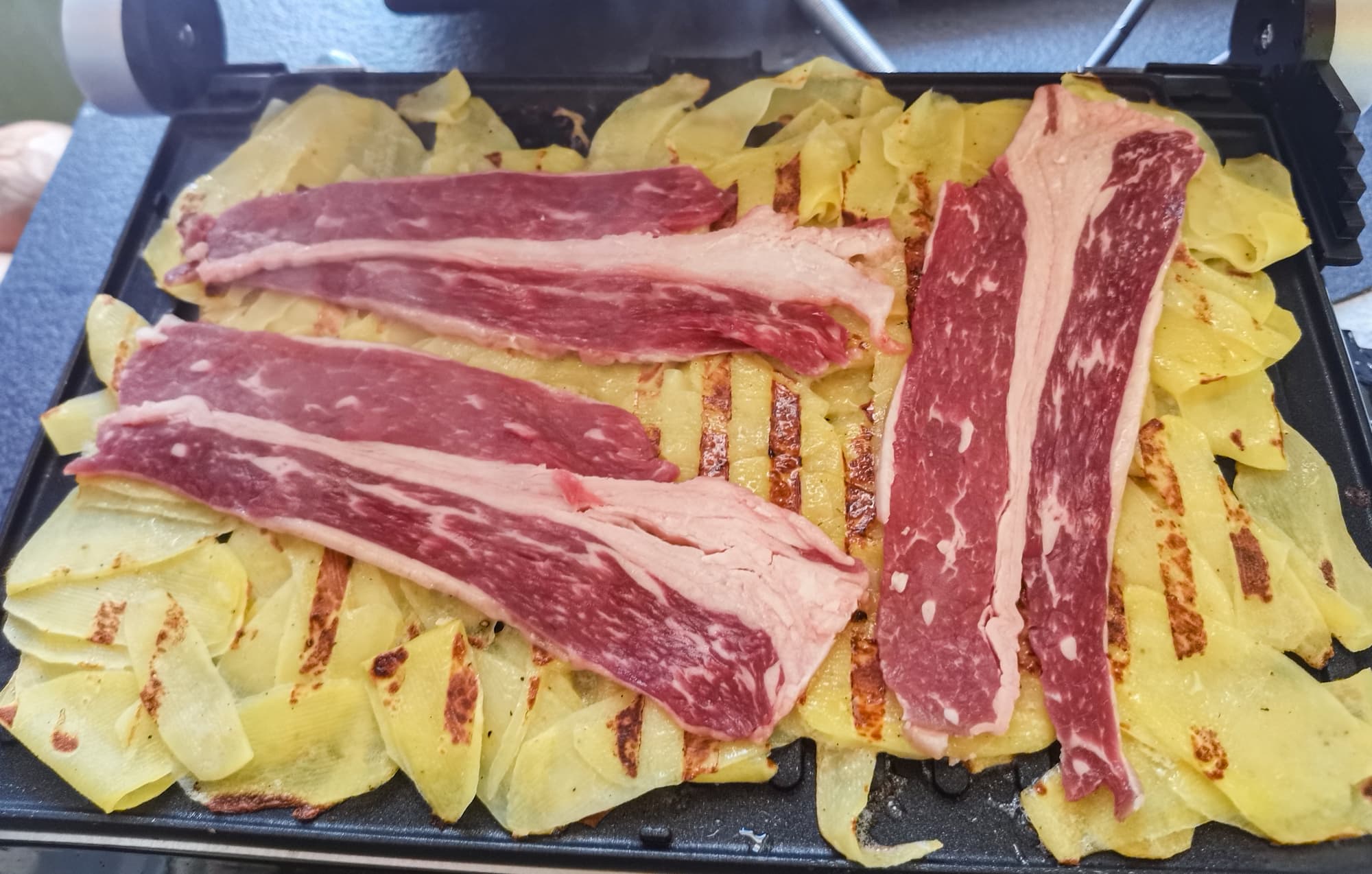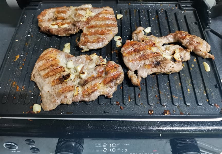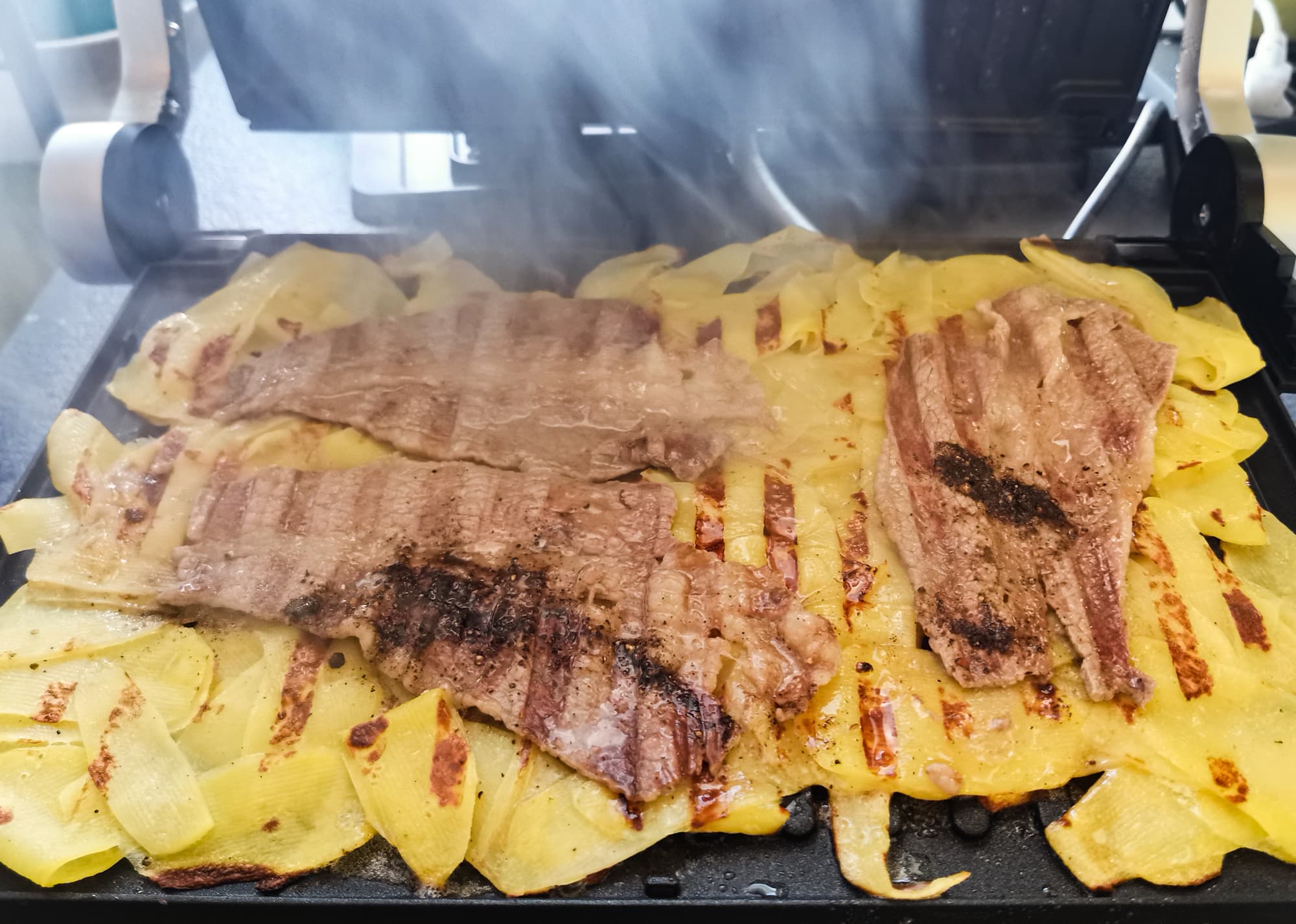 Гриль позволяет готовить картошку и мясо разными способами. Температуры панелей хватает для одновременного приготовления, для запечатывания мяса и для хорошей прожарки толстого слоя картошки.