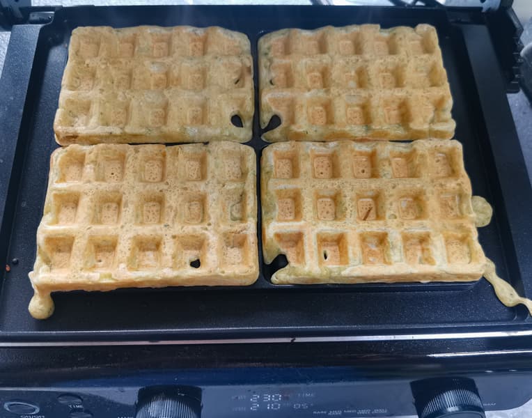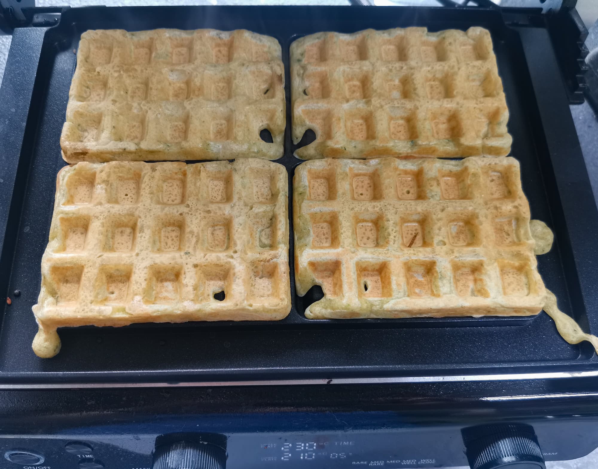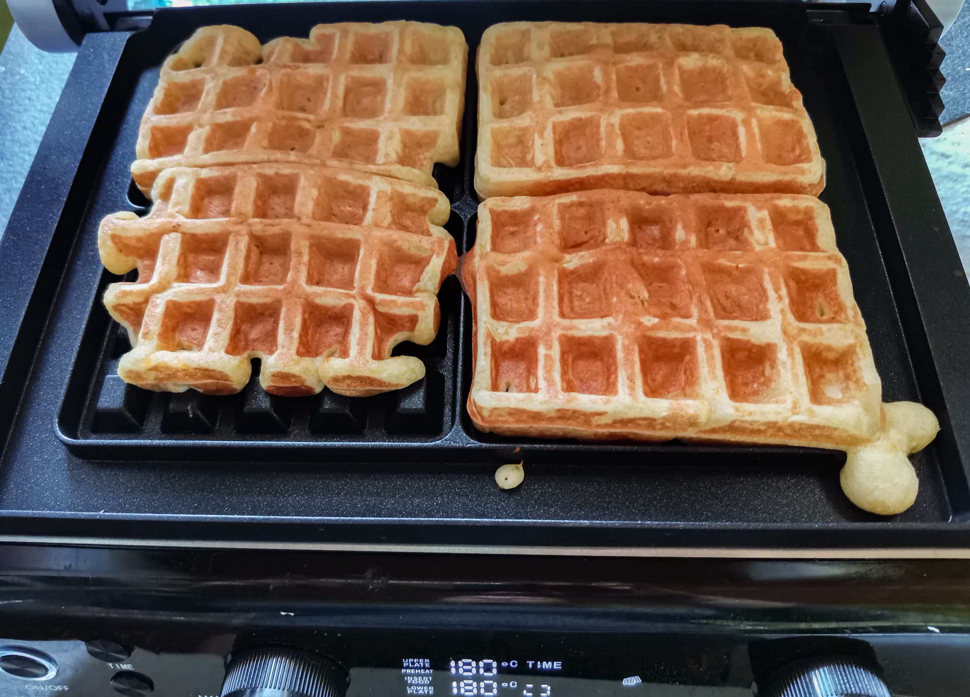 В гриле установили панели для вафель. Выпекали на программе «вафли». Как показала практика, верхняя панель немного недогревается по сравнению с нижней, а для выпечки это критично, так как низ начинает готовиться сразу после выкладывания теста, а верх — только после закрытия крышки. Поэтому лучший результат получается, если выставить температуру вручную, на нижней панели она должна быть на 20-30 °C ниже, чем на верхней.
