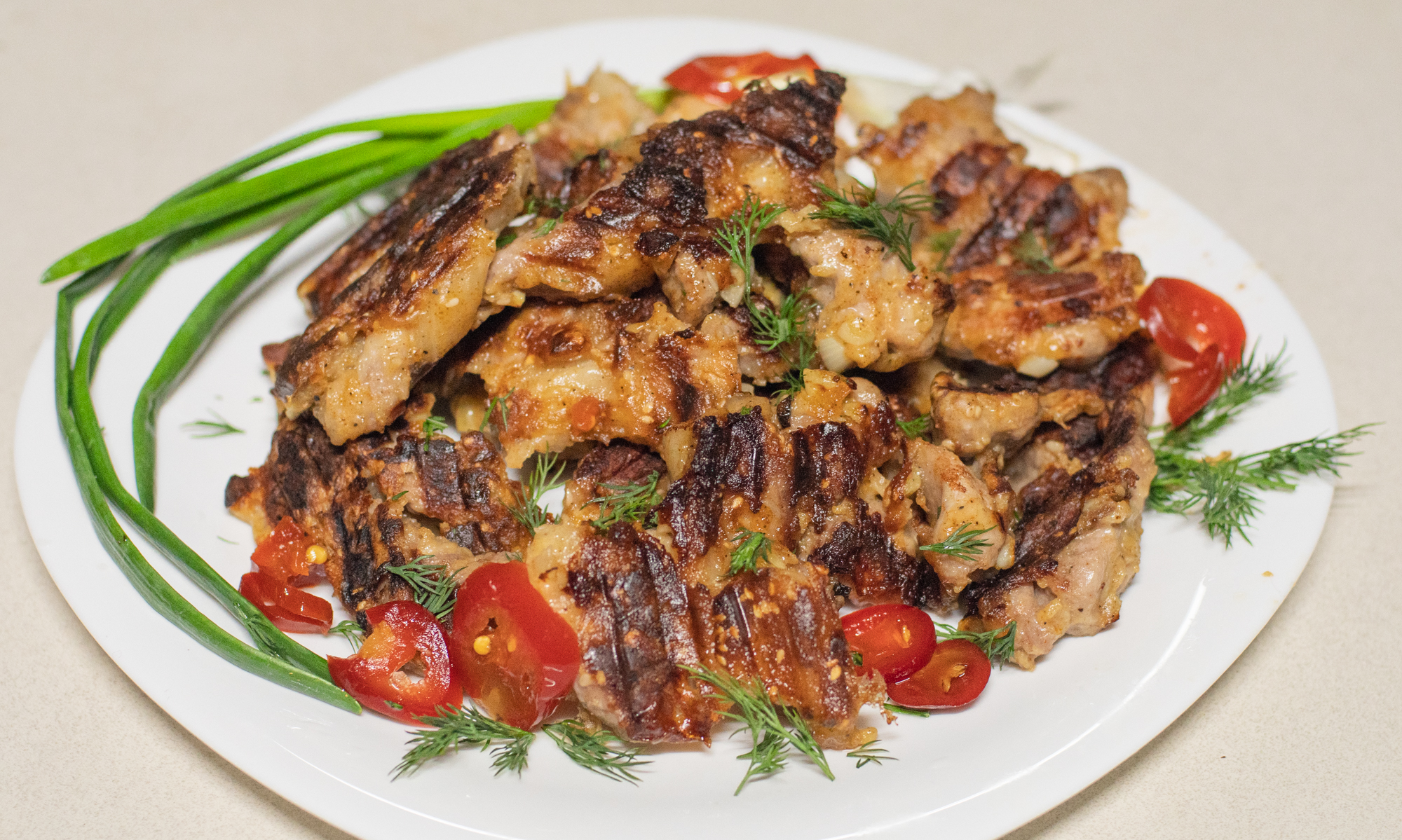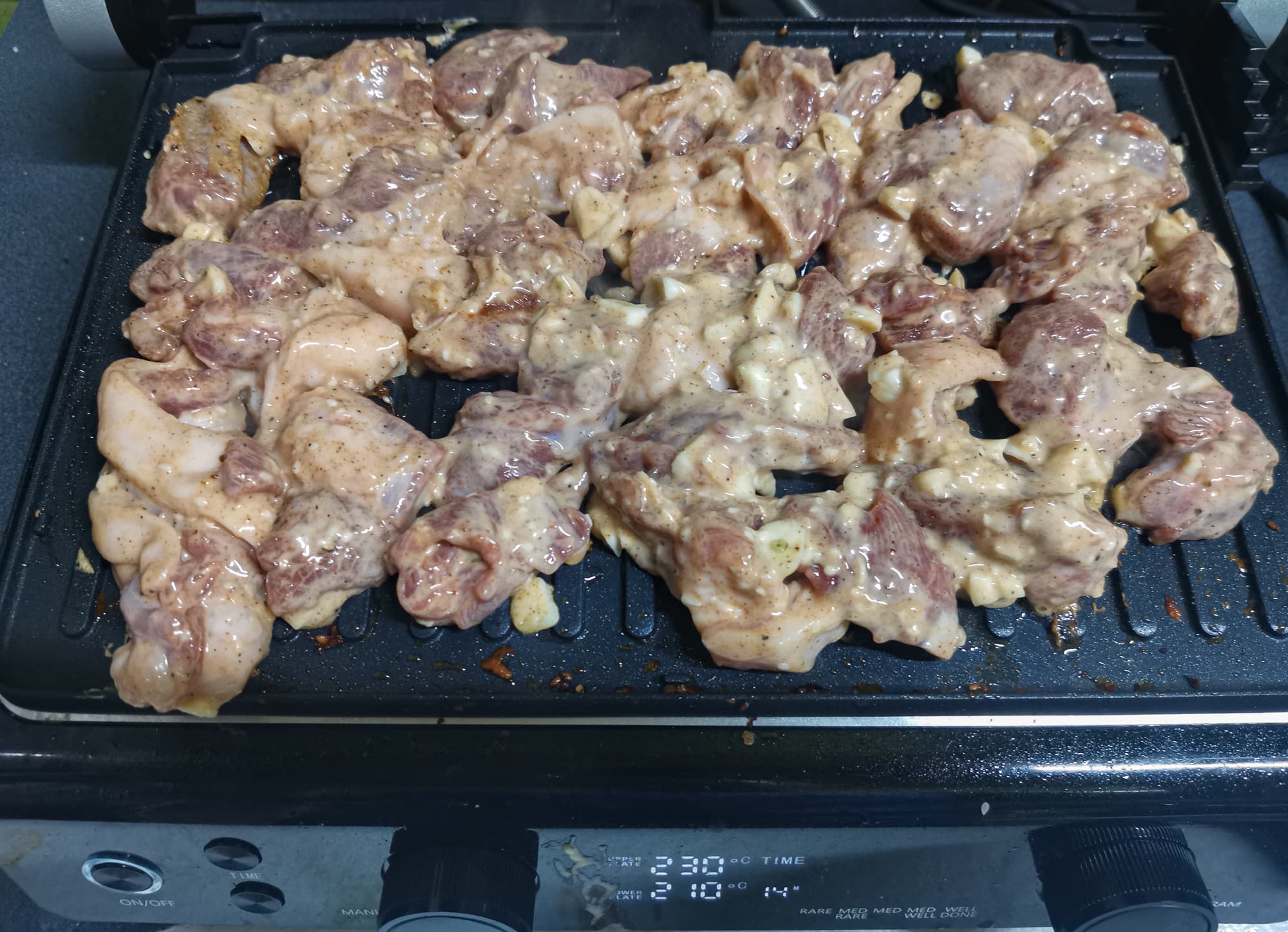 Мясо, нарезанное средними кусками, замариновали в соусе, добавили чеснок, обваляли в остром тесте с кунжутом. Выложили на гриль, выставив максимальную температуру на верхнюю панель и среднюю на низ.