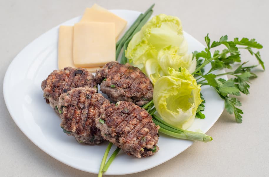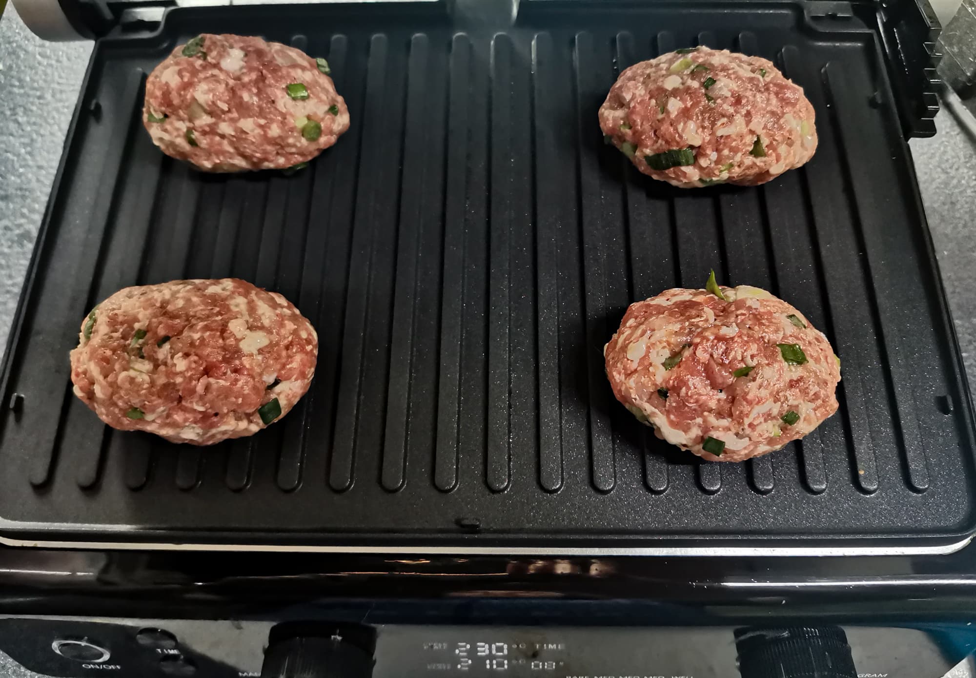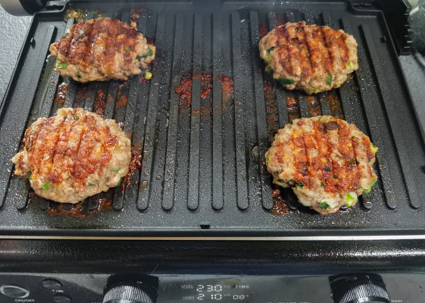 Для котлет мы смешали два вида фарша, говяжий и свиной, со специями и зеленью. Сформировали котлеты, выложили на разогретые панели. Была выставлена температура верхней панели 230 °C и нижней панели 210 °C.