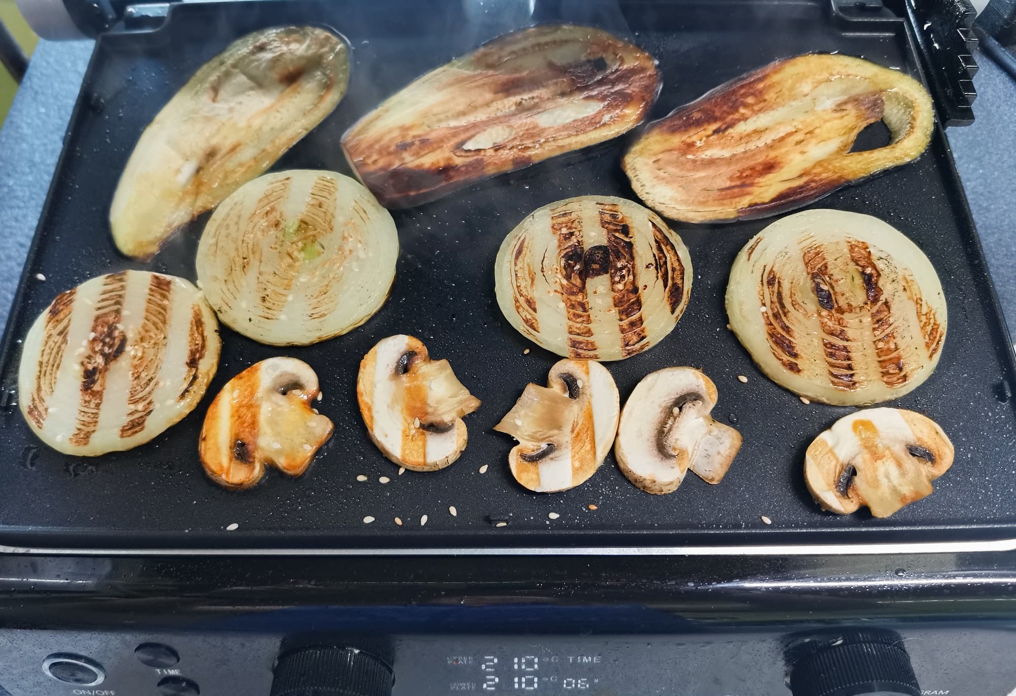 Свежие баклажаны, лук и шампиньоны порезали произвольными кусками, но стараясь сохранить примерно одинаковую толщину. Выложили на гриль, смазанный маслом. Выставили температуру 210 °C на обеих панелях.