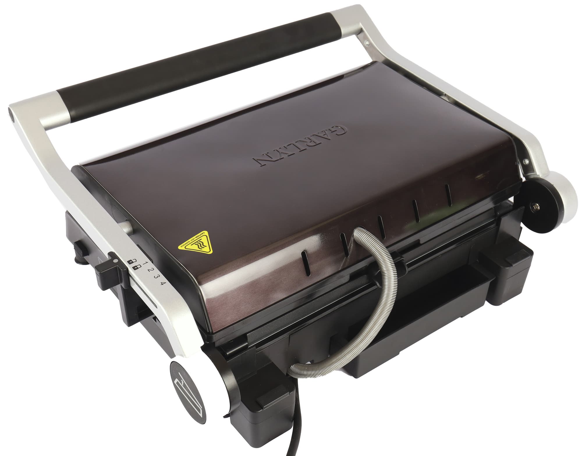 При нажатии на большую кнопку, расположенную сбоку ручки, прибор можно открыть на 180°. Таким образом его можно использовать как настольное барбекю. При закрытии кнопку тоже нужно нажать, иначе ручка останется в заблокированном положении.