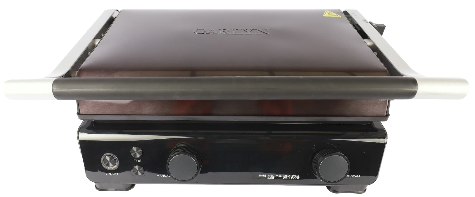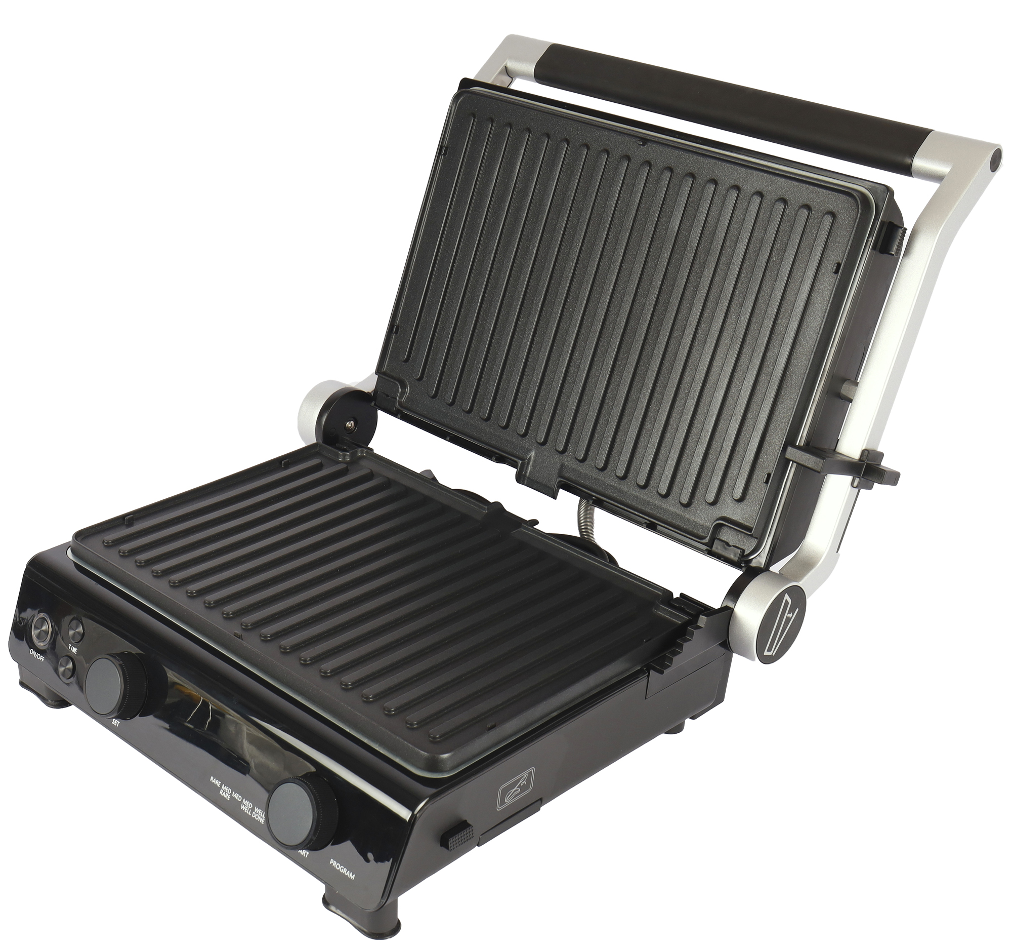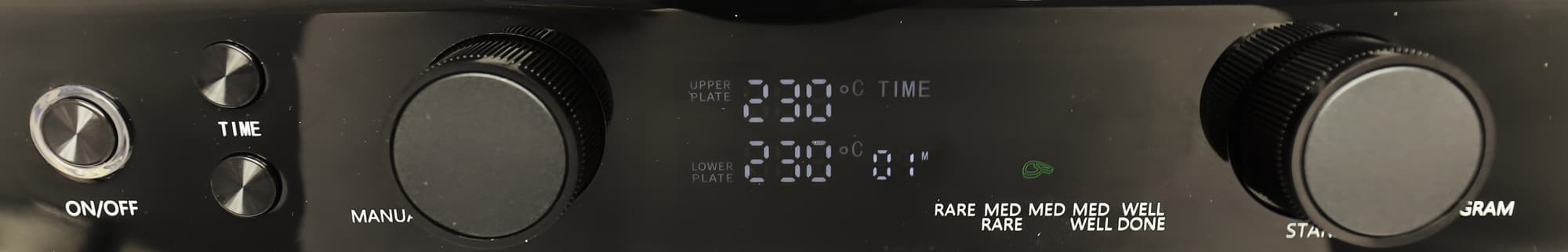 Самая левая кнопка — кнопка включения/выключения. Две следующие небольшие кнопки — установка таймера. Без установленного таймера не запустить гриль в ручном режиме. Большая поворотная ручка слева — регулятор температуры верхней и нижней панели в ручном режиме. Смена температуры происходит поворотом, смена панели для установки температуры — нажатием. Большой регулятор справа — установщик автоматических режимов. Поворотом регулятора режимы устанавливаются, нажатием запускаются (в том числе и ручной режим) Между двумя регуляторами находится дисплей с показателями температуры и индикаторами режимов.