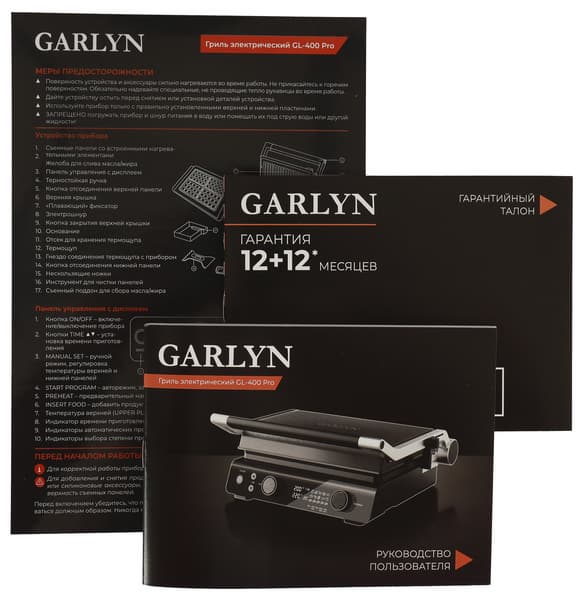 Руководство пользователя для гриля Garlyn GL-400 Pro — небольшая книжка из 32 страниц на русском языке. Она содержит разделы: меры предосторожности, перед началом работы, использование, рекомендации, уход, устранение неисправностей, технические характеристики и комплектация. В принципе, общее понимание работы прибора после прочтения появляется, однако многие детали в инструкции отсутствуют и узнавать их придется экспериментальным путем или с помощью интернета.
