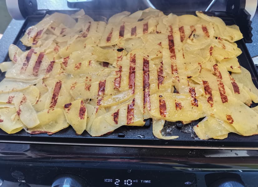 На панели-гриль, смазанные маслом, мы выложили слой тонко нарезанной картошки в соли и специях.