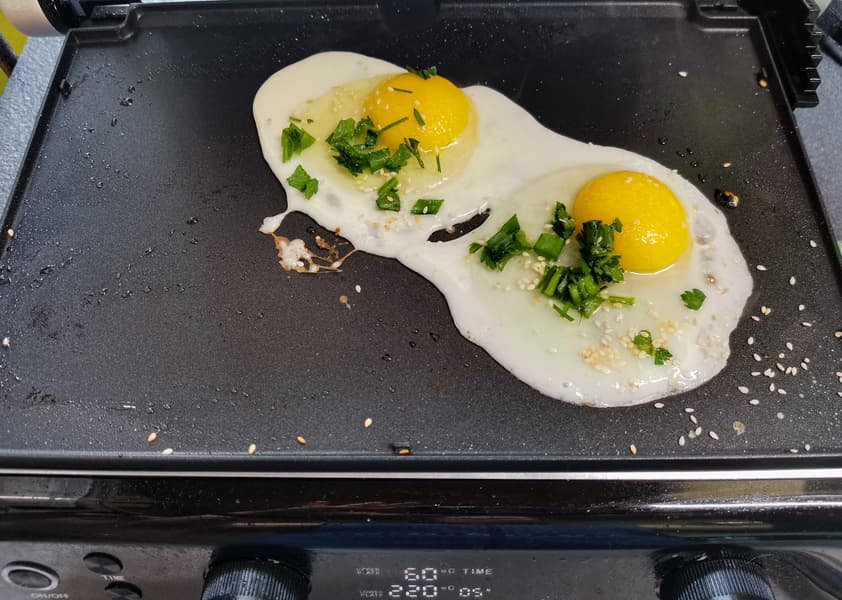 Для приготовления яичницы мы установили в гриль плоскую панель снизу и гриль-панель сверху.