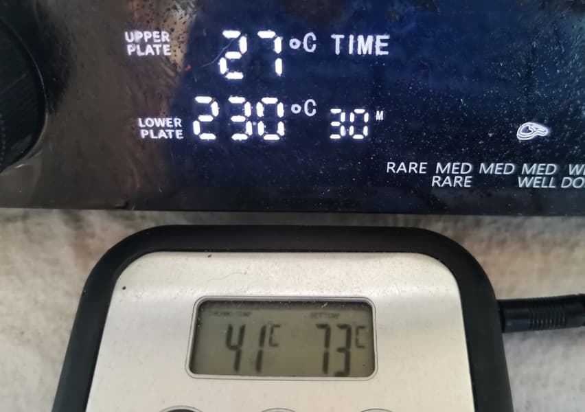На тестовом щупе задали температуру 73 °C и стали следить за процессом. Сначала гриль определил, что длительность готовки составит 24 минуты, затем изменил время. В результате от начала включения прибора до готовности рулета прошло менее 20 минут. Прибор просигнализировал готовность, когда на его панели была показана температура щупа 64 °C, в это время тестовый щуп показывал 71 °C. Мы выключили гриль, но несколько минут температура внутри повышалась и достигла 77 °C по замерам тестового щупа.