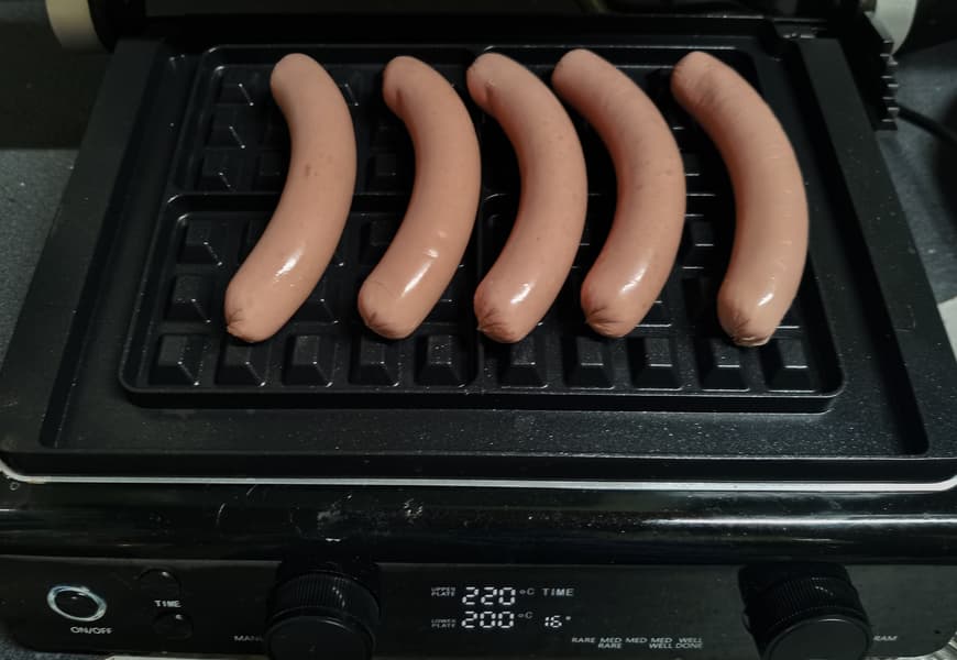 Несмотря на то, что эти панели не предполагают жарку сосисок, в гриле неплохо удалось приготовить молочные сосиски, которые потом можно завернуть в вафли, добавив соус.