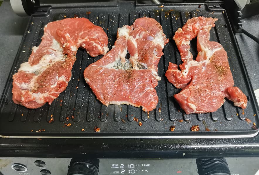 Куски шейки без предварительной мариновки выложили на предварительно разогретые панели-гриль.