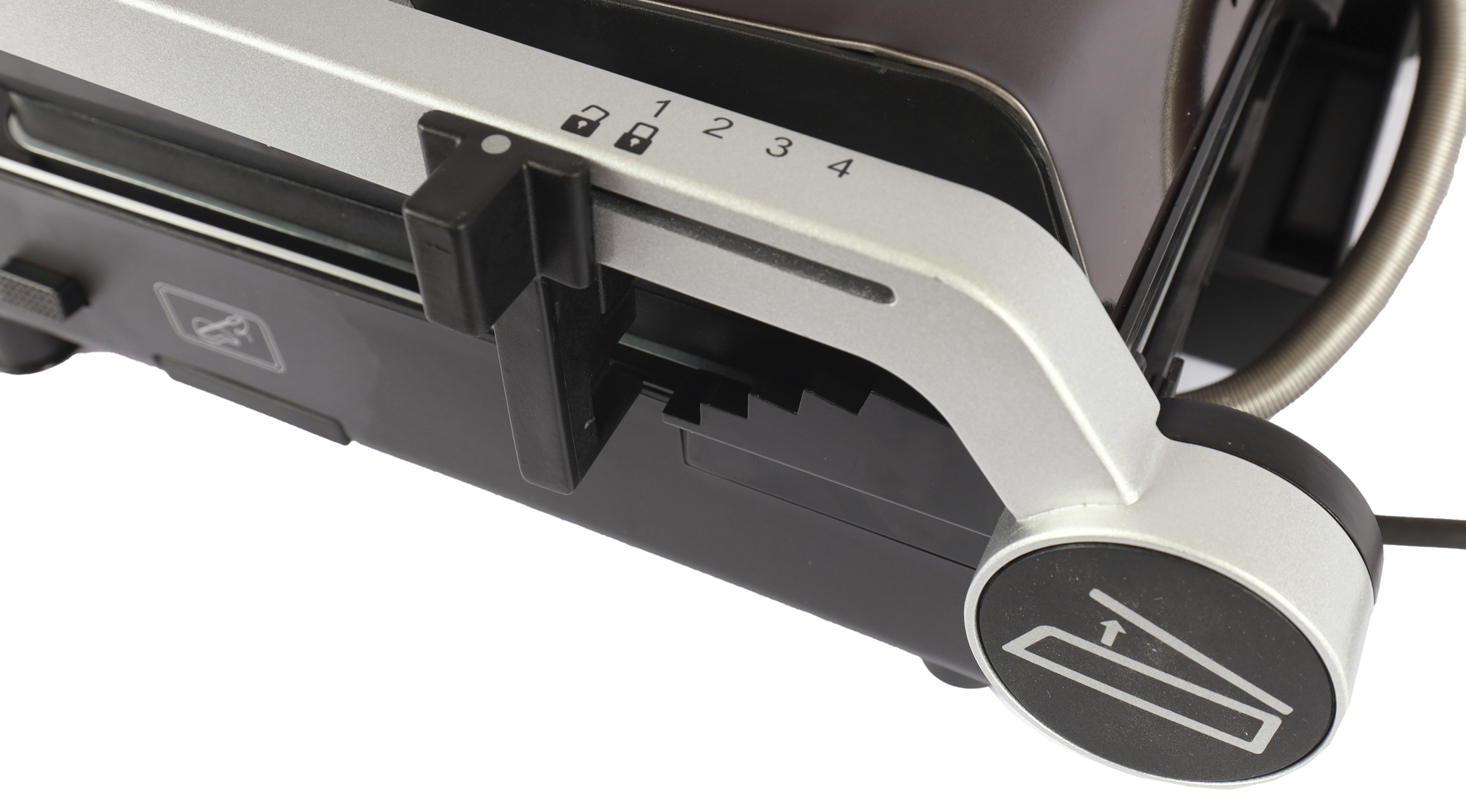 Для выставления расстояния между панелями на ручке расположен плавающий фиксатор. В этом приборе он особенно актуален, потому что верхняя панель тяжелая и при свободном опускании может расплющить продукты, находящиеся на гриле. Фиксатор свободно перемещается, если ручка находится в открытом положении. Можно выбрать 4 ступени расстояния между панелями.