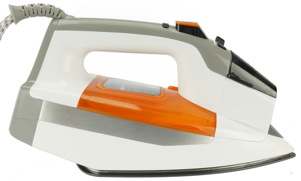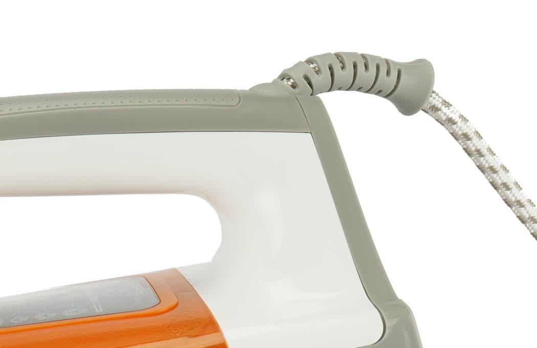 Наш гость практически не отличается от современных типовых утюгов: корпус с подошвой, резервуаром для воды и возможность регулировки температуры, ручка с элементами управления на ней и длинный шнур в тканевой оплетке с кожухом для противодействия сгибанию и шарнирным креплением. Корпус выполнен в бело-серой гамме. Внешний вид оживляют резервуар для воды оранжевого цвета и мелкие детали темно серого и черного цветов.