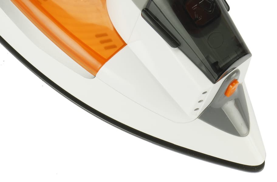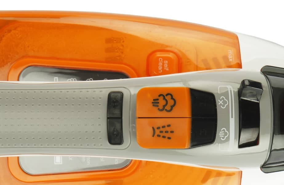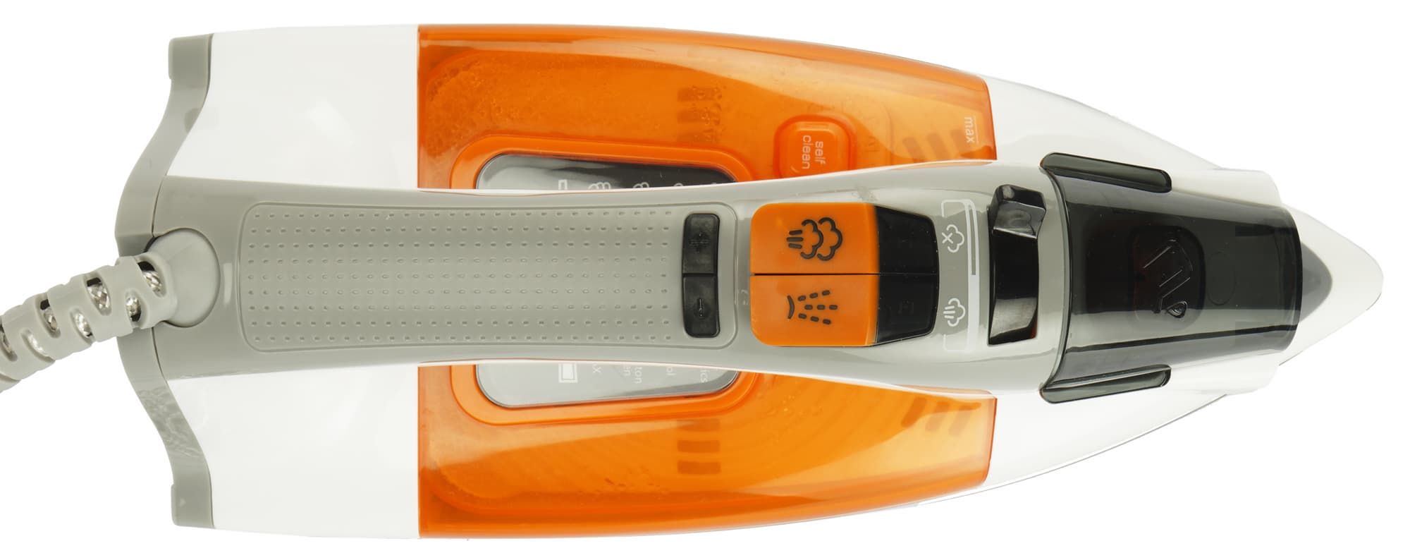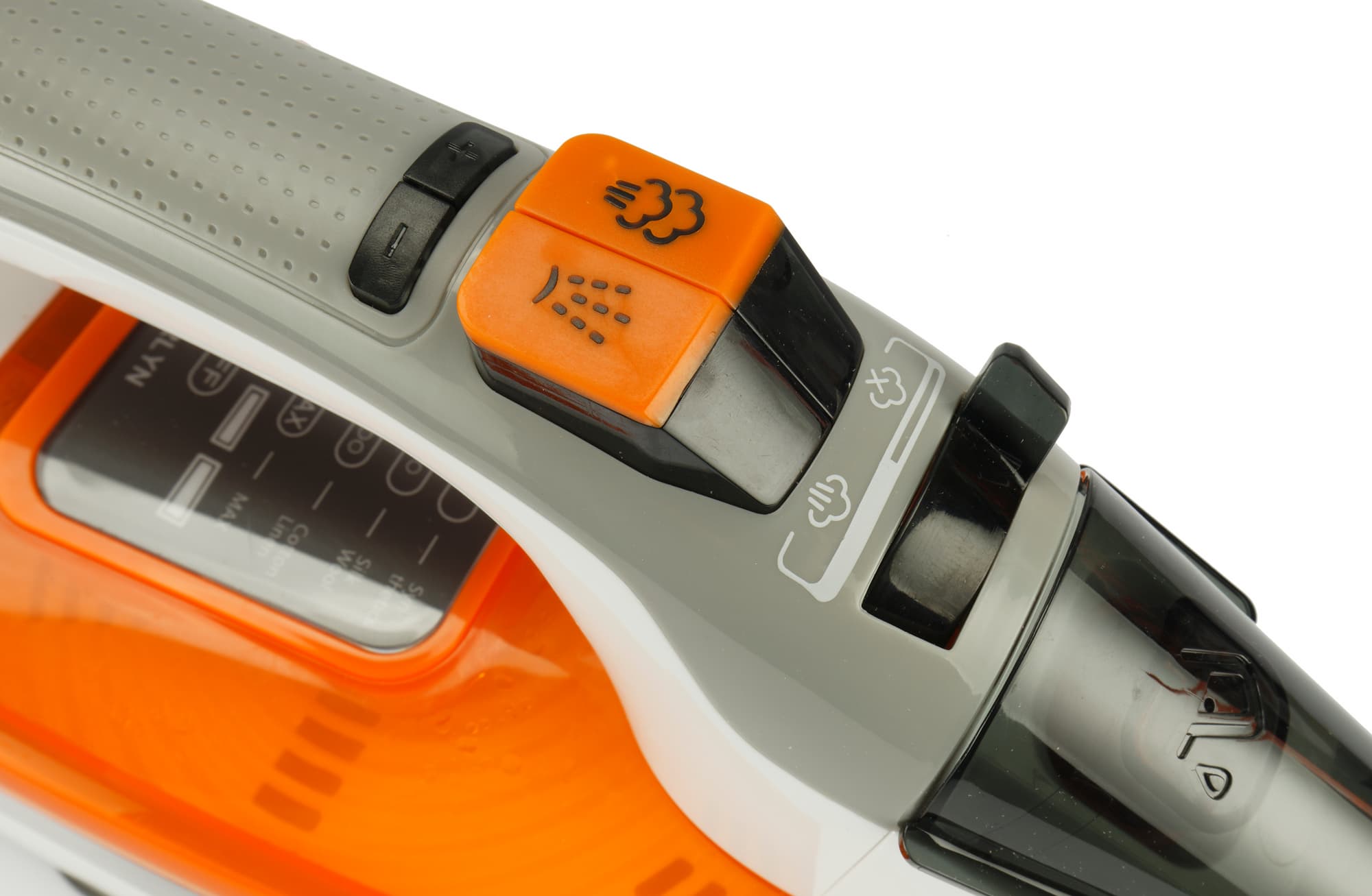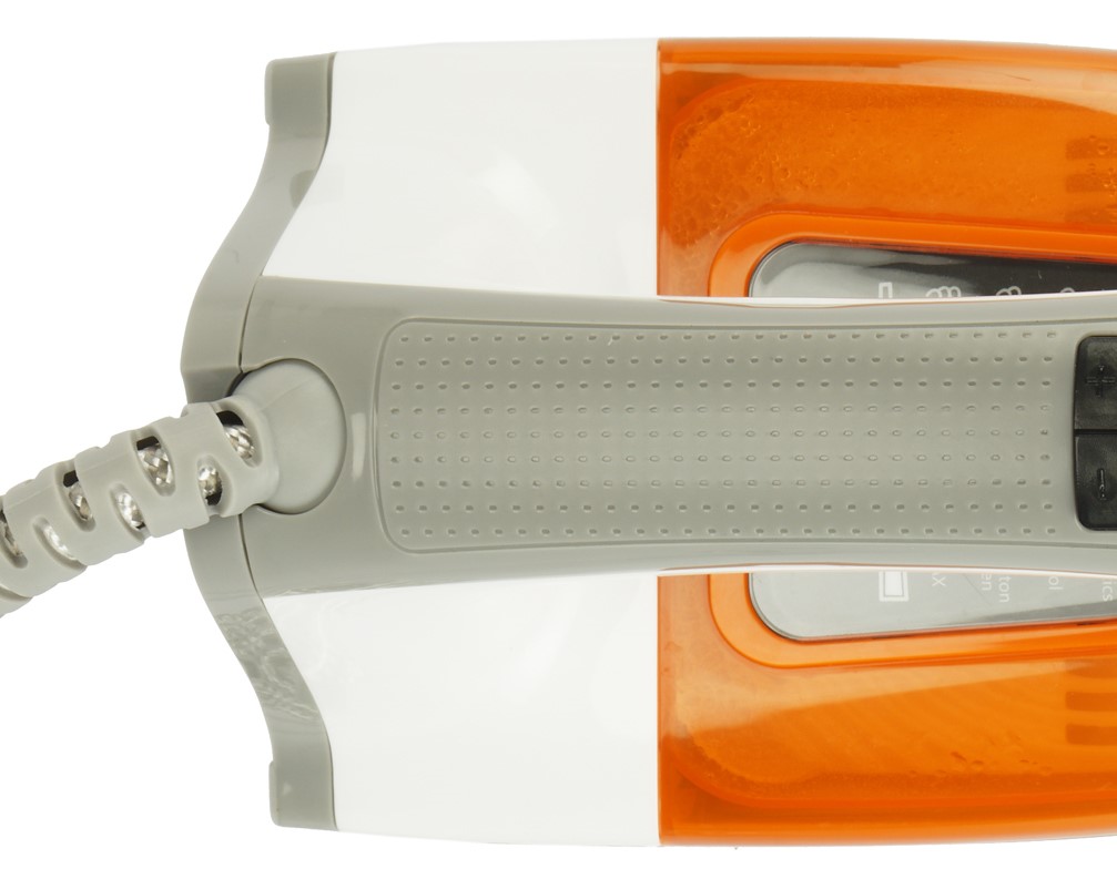 Ручка в месте соприкосновения с ладонью пользователя прорезинена и имеет небольшой рельеф для лучшего сцепления, поэтому утюг совсем не скользит в руке. Прямо в хватовой области находятся черные кнопки переключения режимов работы — мы не уверены, что это удобно, но наверняка узнаем при тестировании. Оранжевые клавиши парового удара и разбрызгивания находятся в привычном месте, без особых усилий надавливаются большим пальцем. Чуть выше виден переключатель режима подачи пара. Двигаясь далее к носику, можно найти полупрозрачную серую крышку, накрывающую отверстие для заливки воды, а под ними сопло разбрызгивателя — как мы и говорили, конструкция обычная.