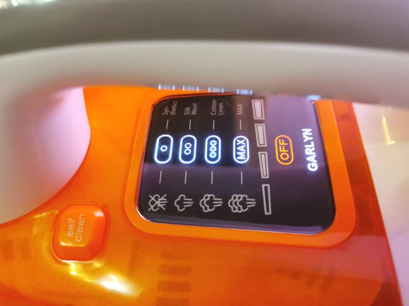 Первого режима оказалось недостаточно, поэтому мы выбрали второй и включили подачу пара на минимуме. После этого дело пошло, итоговый результат показался нам не идеальным, но и ткань попалась вредная.