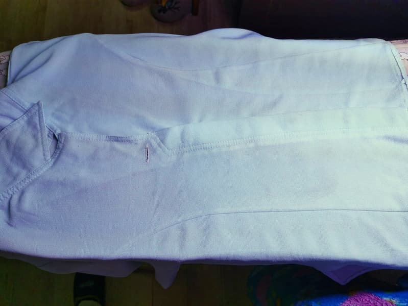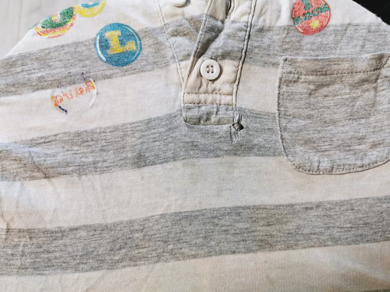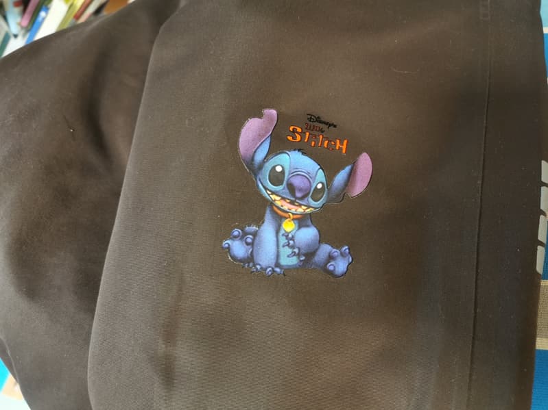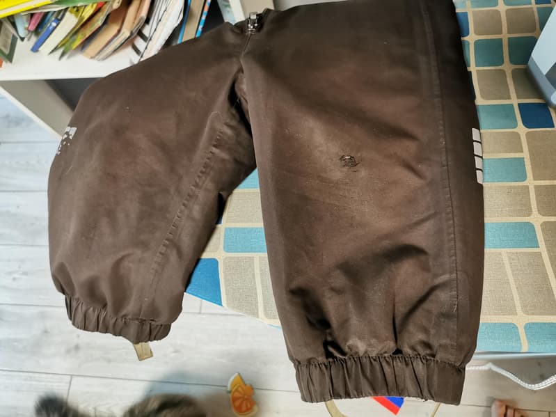 У нас имелась детское хлопковое поло с небольшой дырочкой и детские уличные непромокаемые штаны с отверстием побольше. Такие повреждения обычно устраняются с помощью специальных термозаплаток или термонаклеек. Для работы с ними требуется невысокая температура (мы установили режим «3»).