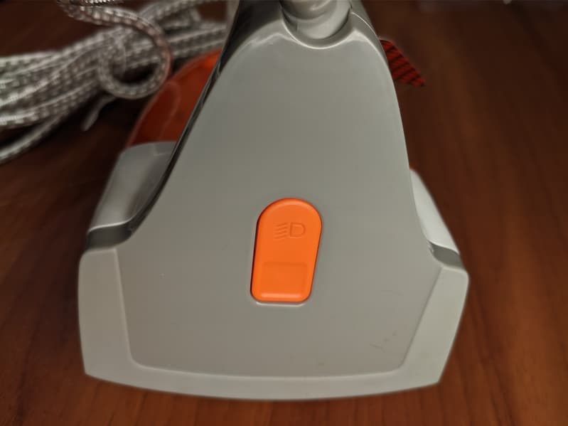 На передней части утюга расположены шесть светодиодов, позволяющих подсветить ткань при глажке, если в этом есть необходимость. Для включения подсветки нужно нажать оранжевую кнопку, находящуюся на задней панели прибора.