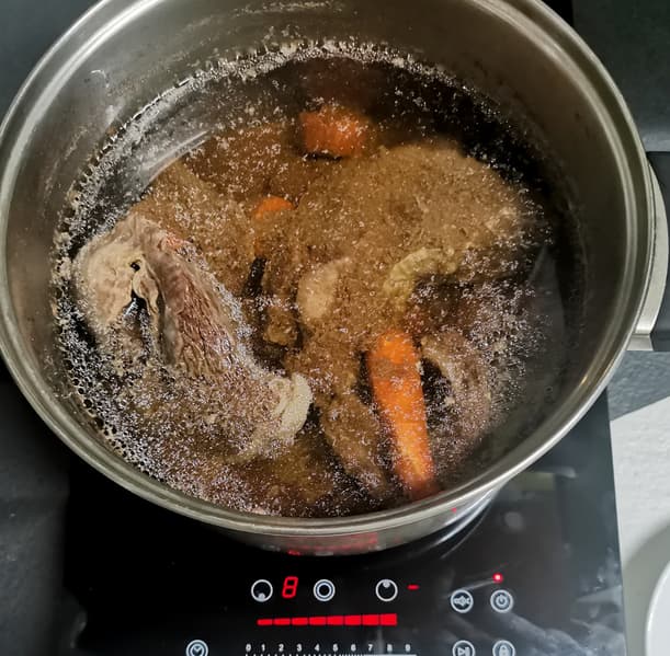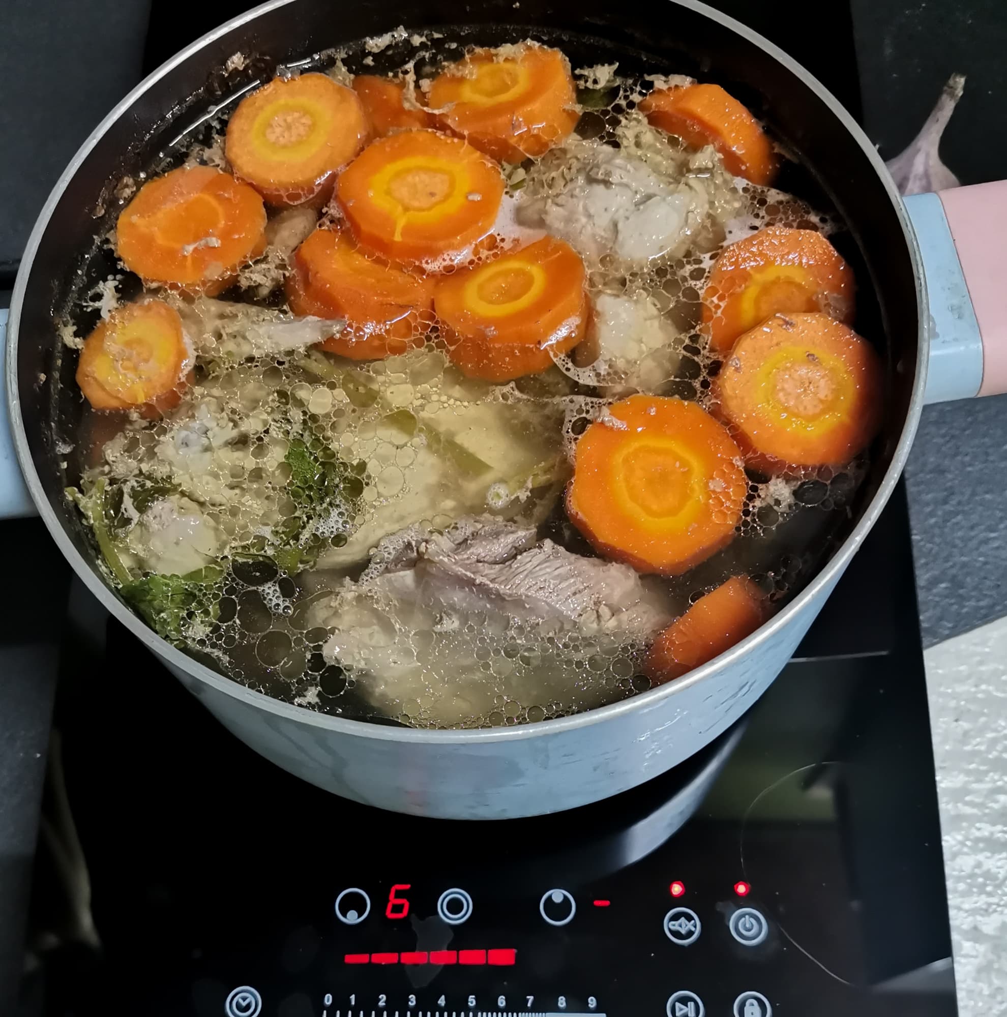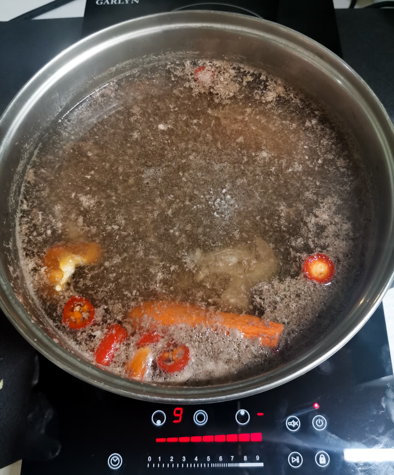 После 20 минут стояния на плитке бульон только нагрелся, поэтому мы выставили таймер на 2 часа, подняли мощность до 9 и оставили бульон вариться.