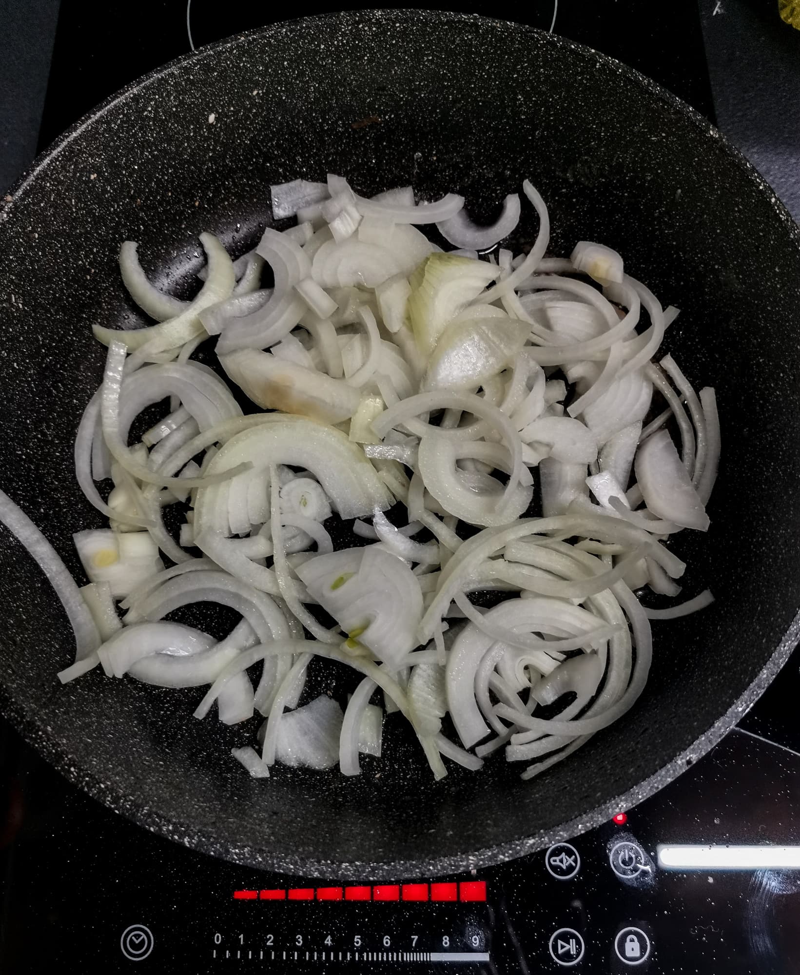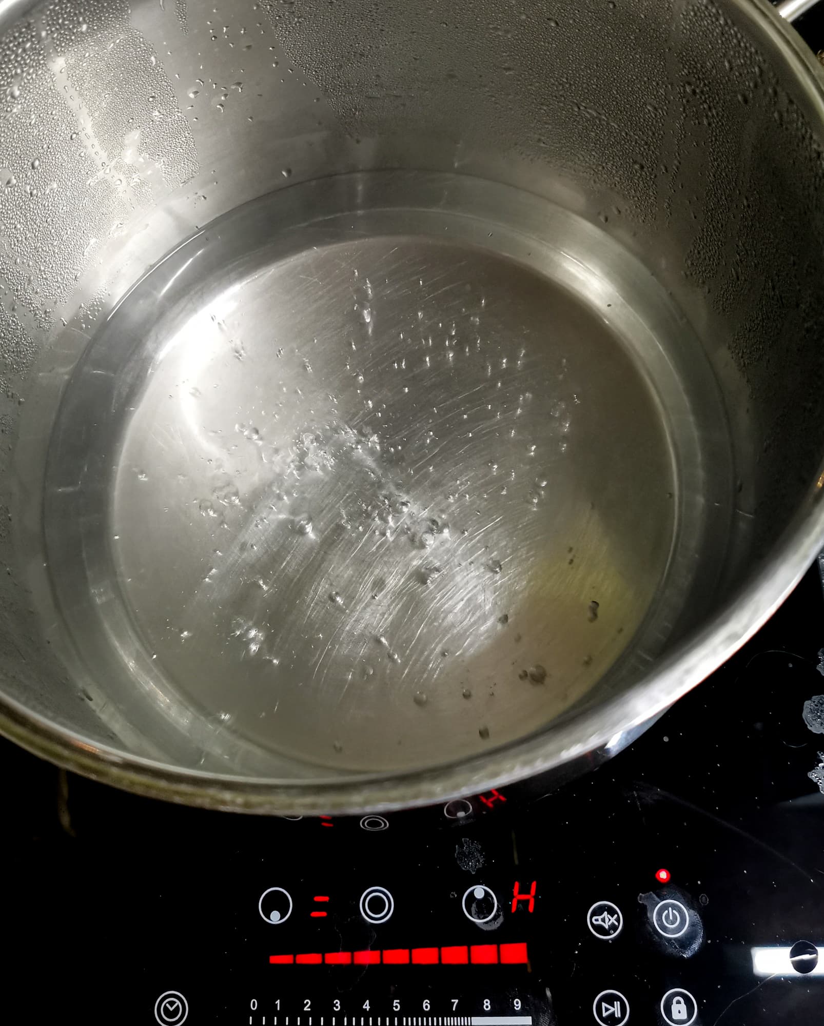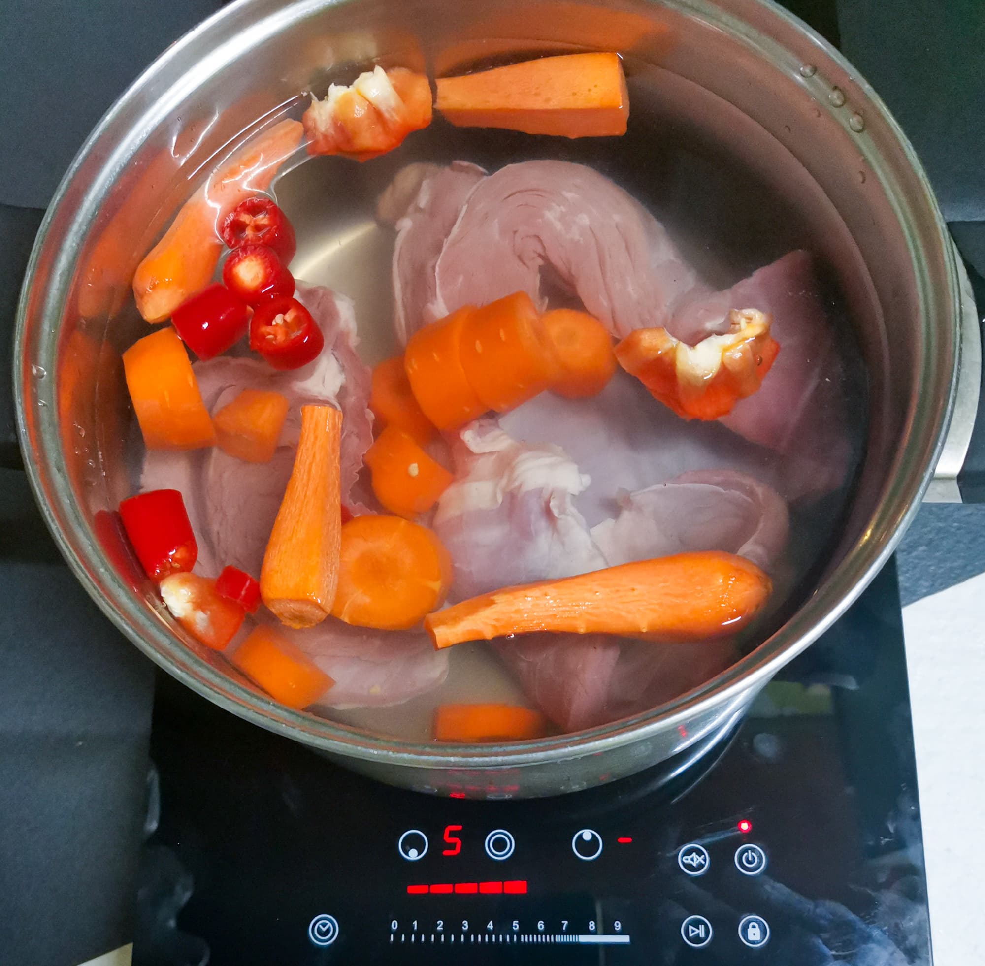 После 20 минут стояния на плитке бульон только нагрелся, поэтому мы выставили таймер на 2 часа, подняли мощность до 9 и оставили бульон вариться.