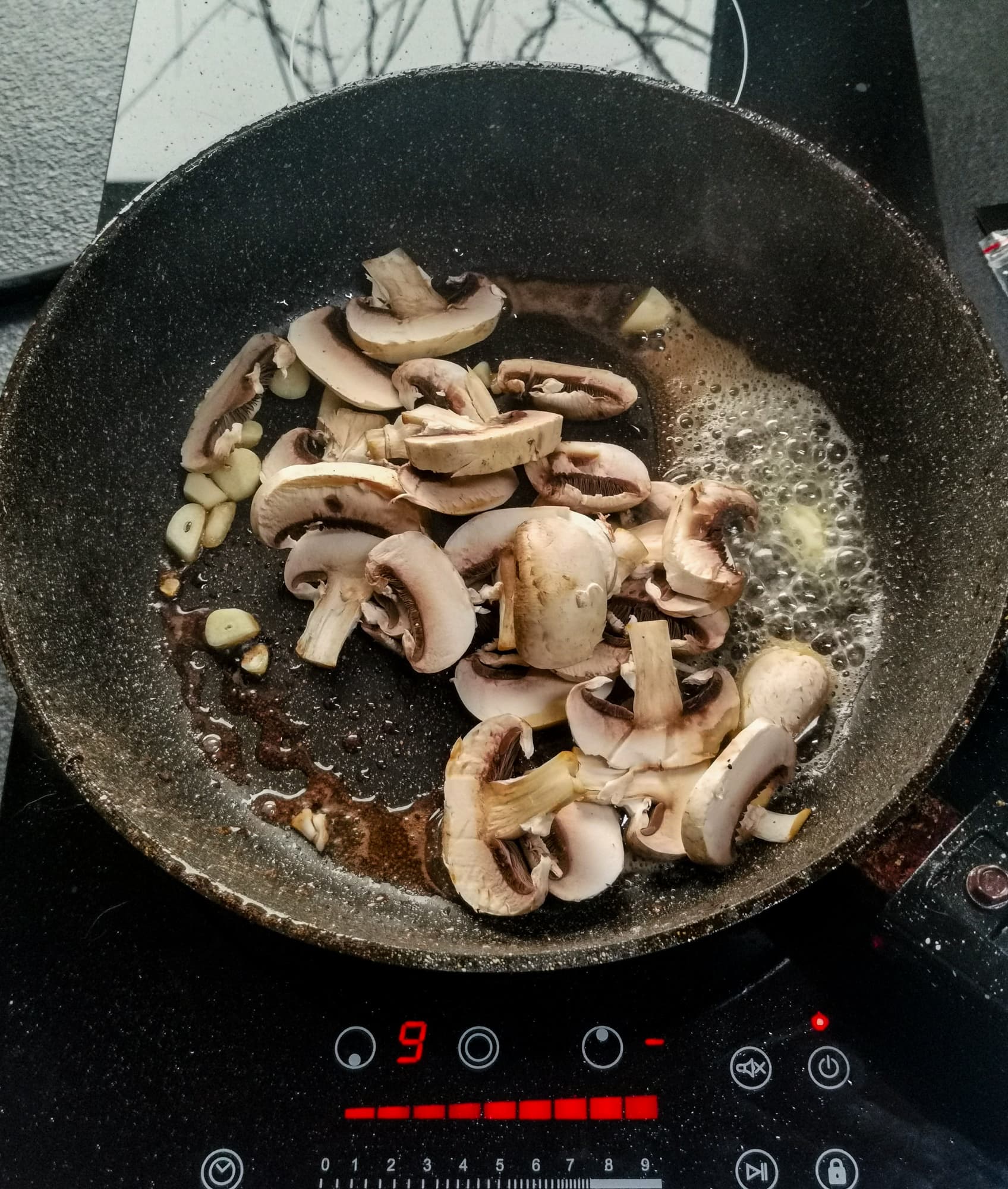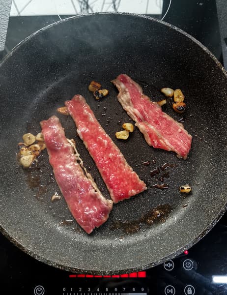 Понимая, что для большого толстого куска стейка у плитки может не хватить мощности, мы взяли тонкие куски говядины, бросили на прогретую сковородку вместе с чесноком. Мясо приготовилось практически за пару минут.