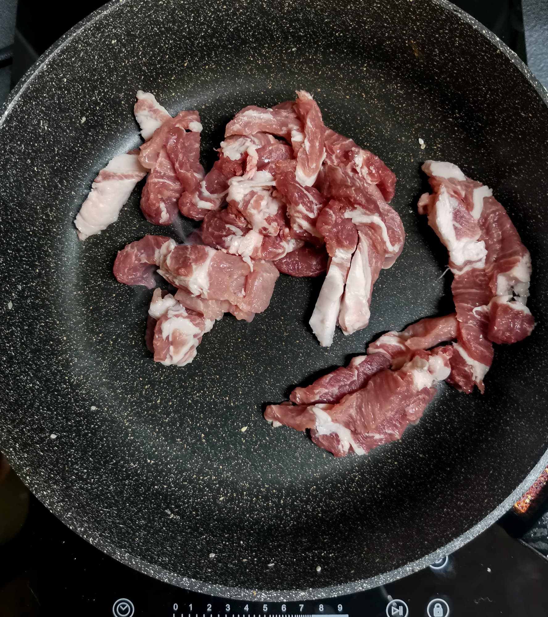 Свинина получилась отлично. Несмотря на большой объем продуктов и сковородку 26 см диаметром, мощности плитки хватило для комфортного приготовления.