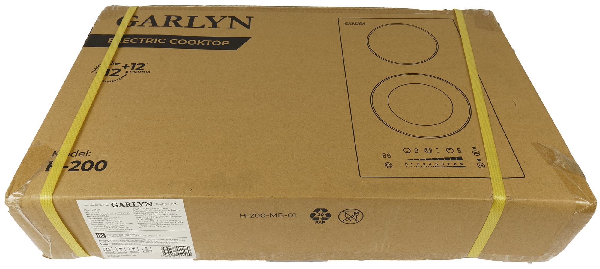 Электрическая варочная поверхность Garlyn Н-200 приехала на тесты в аккуратной коробке из толстого картона. На коробке черным цветом нанесены служебные пиктограммы. Снаружи коробка дополнительно затянута желтой полипропиленовой лентой, ручек и прорезей конструкцией не предусмотрено. Внутри поверхность надежно зафиксирована пенопластовыми вставками. Сбоку наклейка с номером модели и техническими характеристиками, дополненная штрих-кодами.