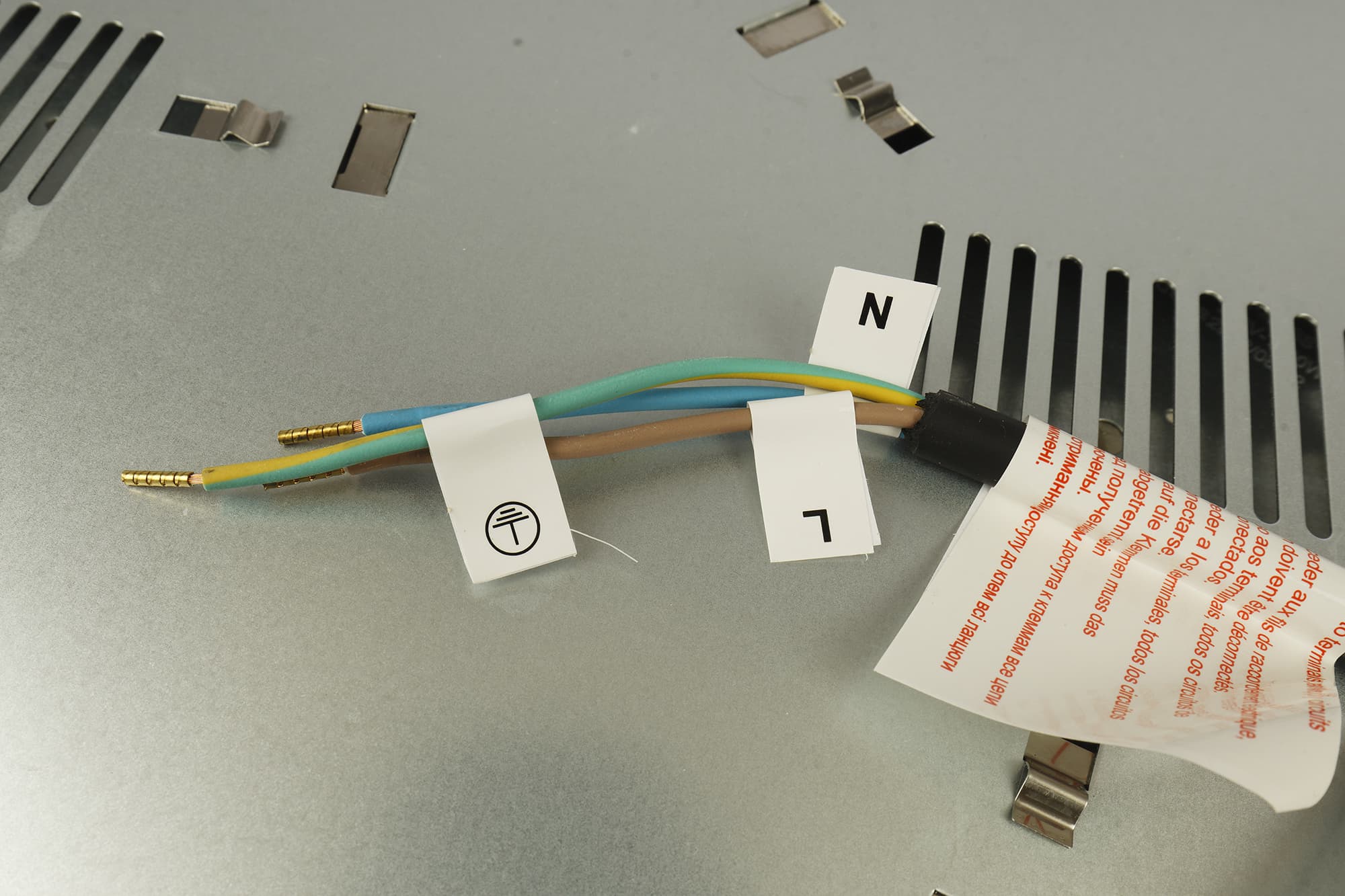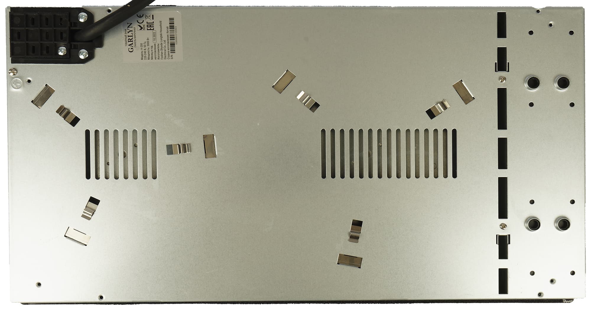 Снизу варочной поверхности, кроме вентиляционных прорезей и технических отверстий, расположена наклейка со сведениями о модели и серийным номером. Выход шнура тоже организован снизу, поэтому плиткой невозможно пользоваться как мобильной без специальных приспособлений.