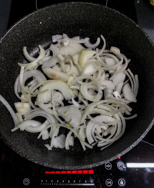 Отложив свинину в отдельную емкость, приступили к овощам. В масле обжарили лук.