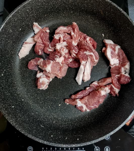 После кунжута на сковородке обжарили свинину до хорошей корочки.