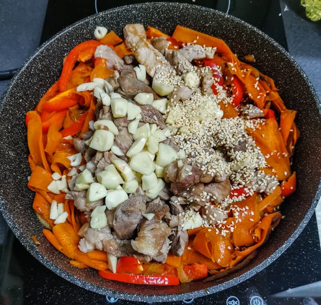 И, когда овощи были готовы, выложили в них свинину, чеснок и обжаренный кунжут и специи. Жарили на максимальной мощности, доливая соевый соус.