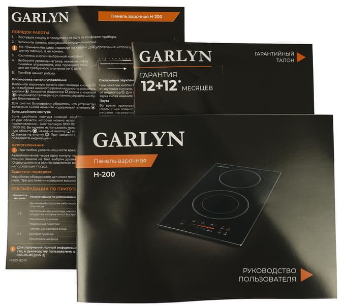 Garlyn Н-200 — варочная стеклокерамическая независимая панель, предназначенная для встраивания. Лицевая часть прибора глубокого черного цвета с отмеченными белым цветом зонами нагрева и панелью управления. Внешний вид прибора минималистичен, без лишних деталей, что позволяет легко вписать его в интерьер.