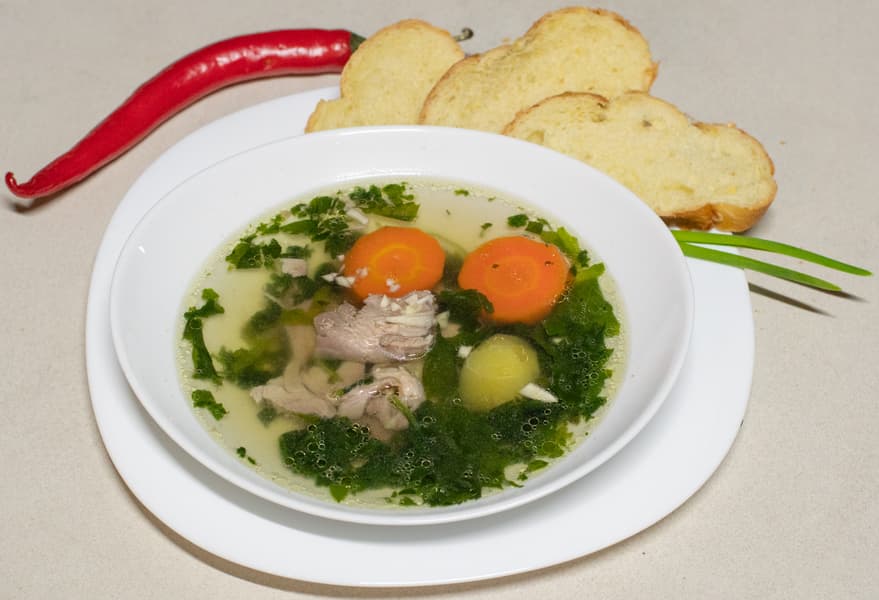 Решив исправить печальный опыт, мы взяли мясо индейки и курицы, поставили вариться вместе с морковкой в кастрюле меньшего объема (3 л). На этот раз выставили мощность 9 на двойном контуре. После закипания регулировали мощность двойного контура в пределах 6-8. В этот раз бульон получился абсолютно нормально, при этом никаких попыток выкипеть он тоже не делал. За несколько минут до готовности добавили в бульон картошку, а после ее готовности шпинат и приправы.