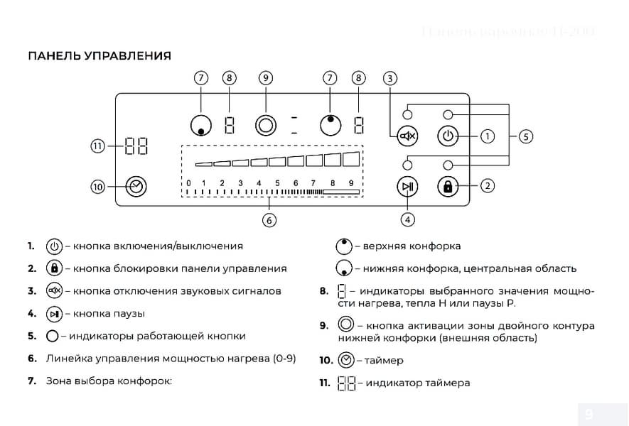 Для запуска конфорки нужно нажать кнопку включения, кнопку выбора зоны нагрева (верх, низ) и выставить мощность от 1 до 9. При выборе режима усиленного нагрева нижней конфорки после нажатия значка нижней конфорки надо нажать кнопку активации зоны двойного контура. Далее под слайдерной полоской индикаторов следует нажать на цифру нужной мощности нагрева. При работе плитки индикаторы конфорок показывают уровень мощности нагрева, а при включенном двойном контуре нижней конфорки, на индикаторе посередине горят две горизонтальные черточки.