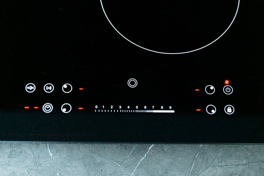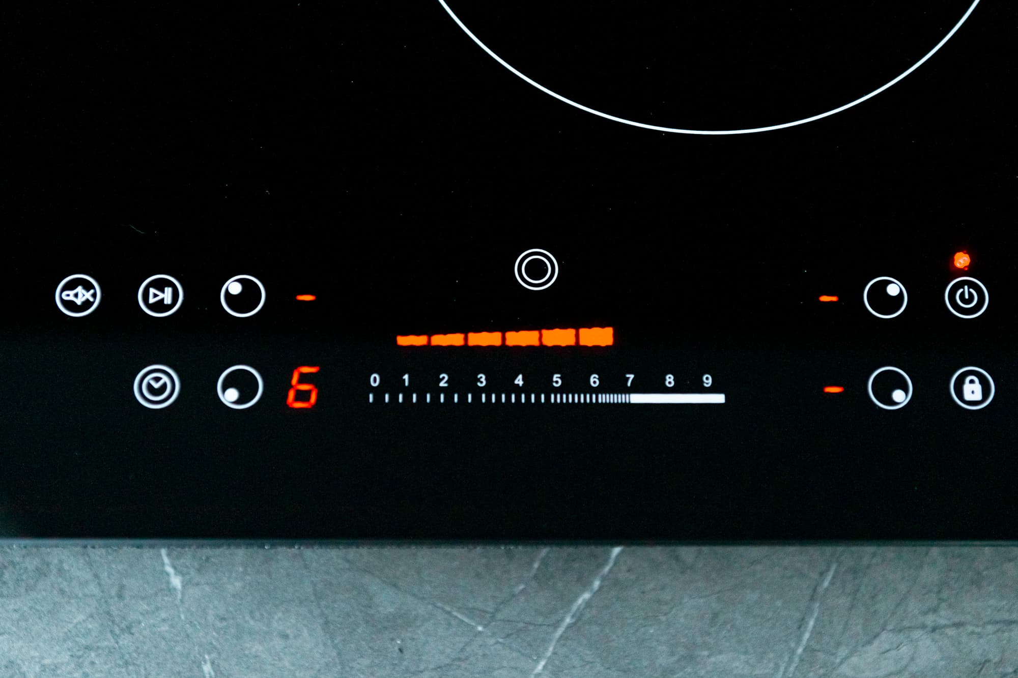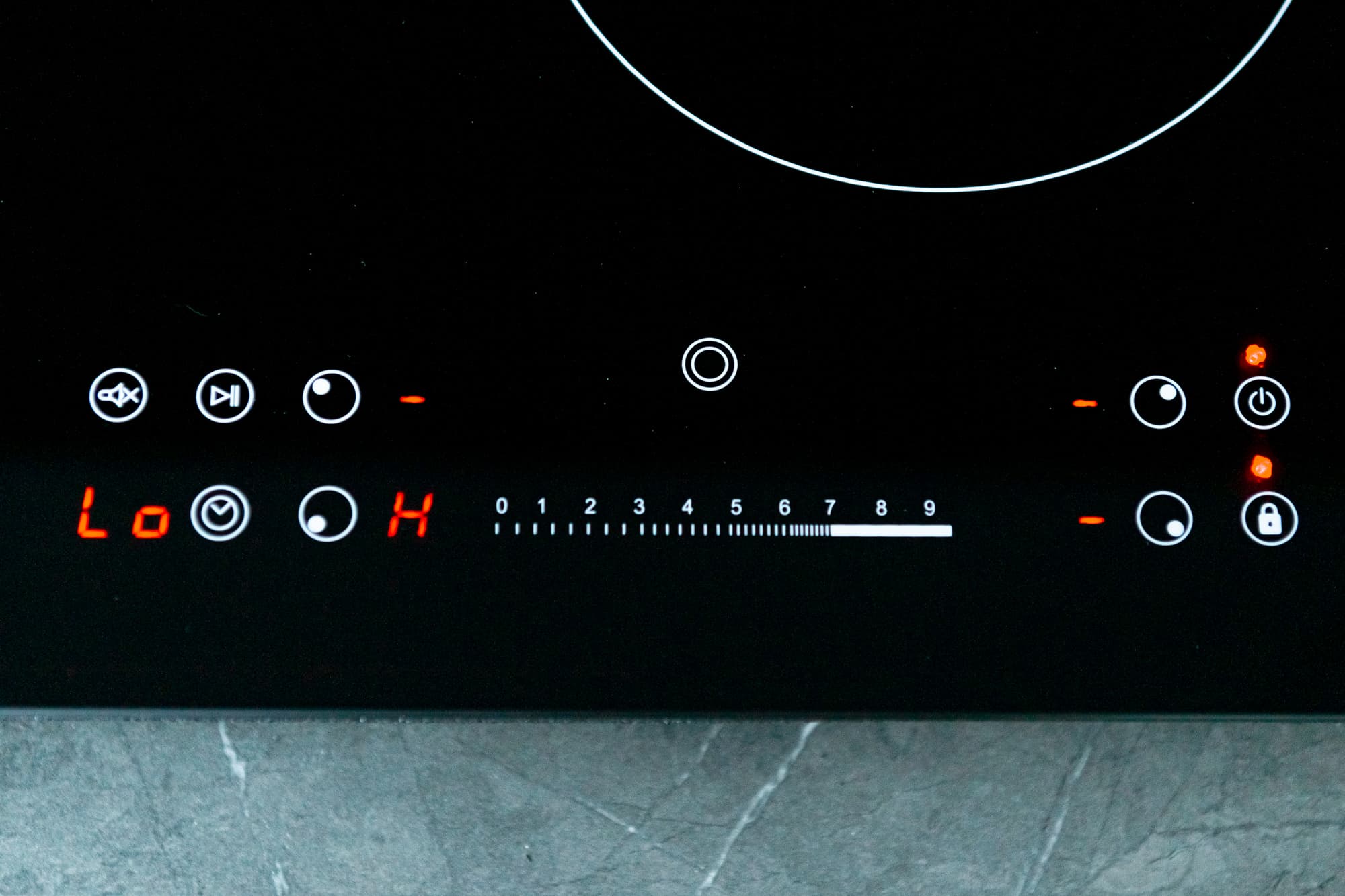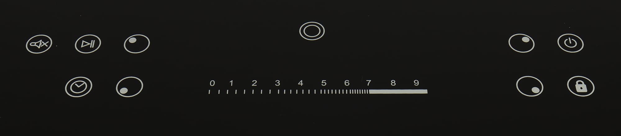 Сенсорная панель управления располагается справа ближе к краю. Слайдер со шкалой мощности нагрева от 0 до 9 находится по центру. Вокруг него — кнопки с иконками и индикаторы.