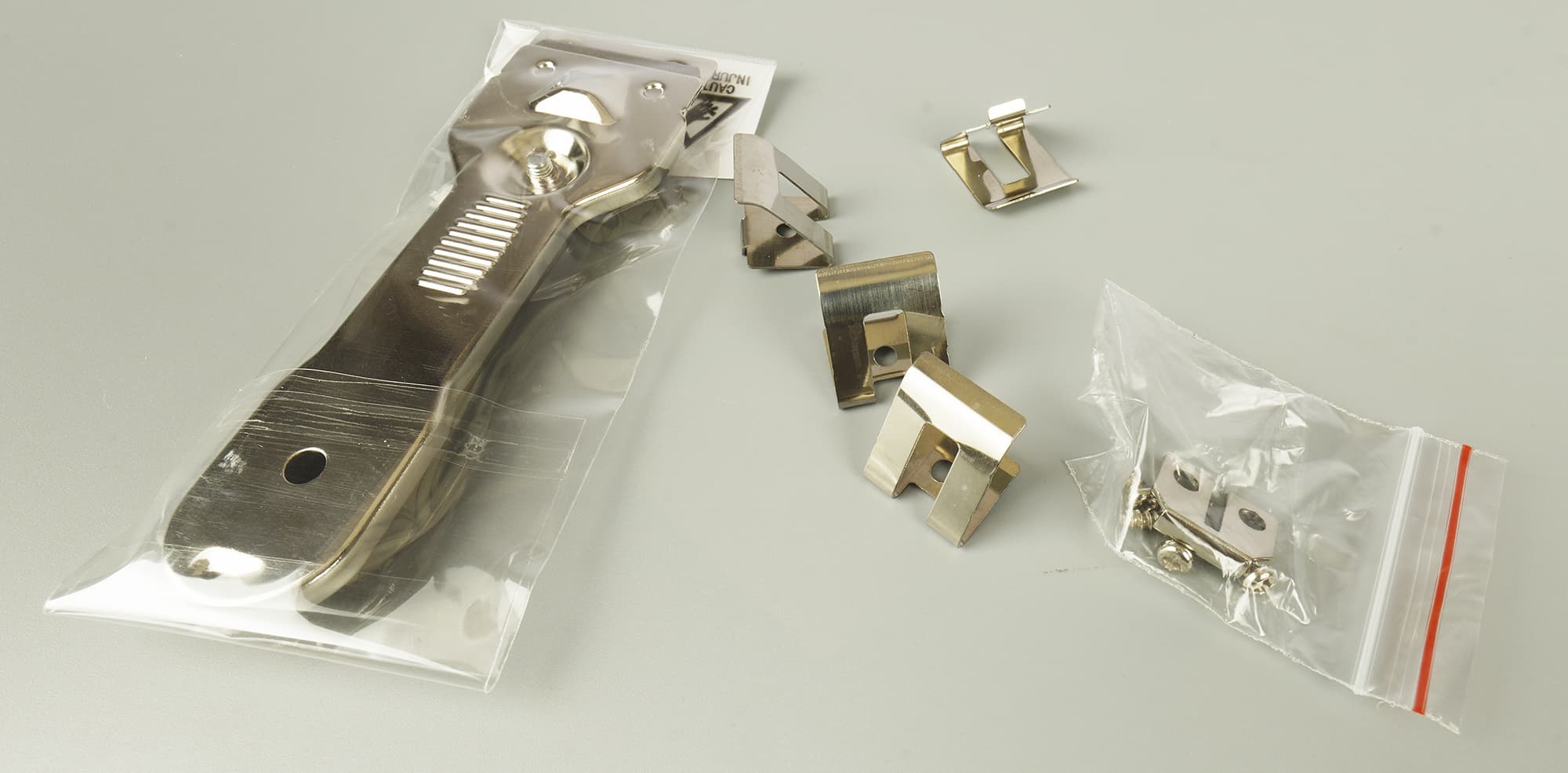 К варочной панели прилагается специальный металлический скребок для стеклокерамики со сдвижной защитной крышкой и крепежи.